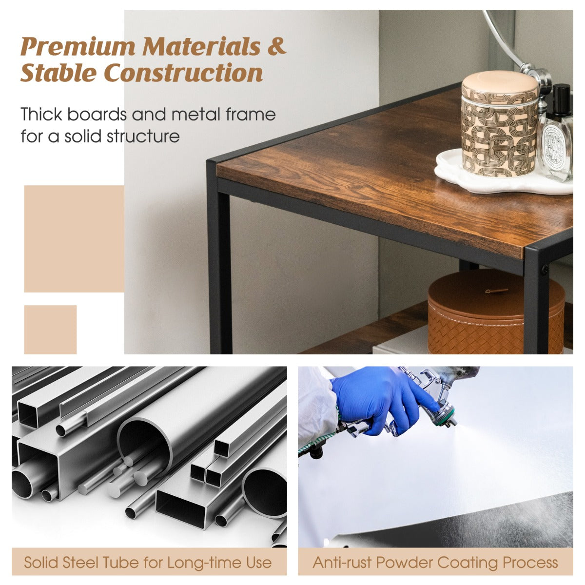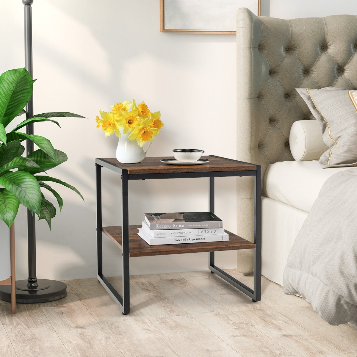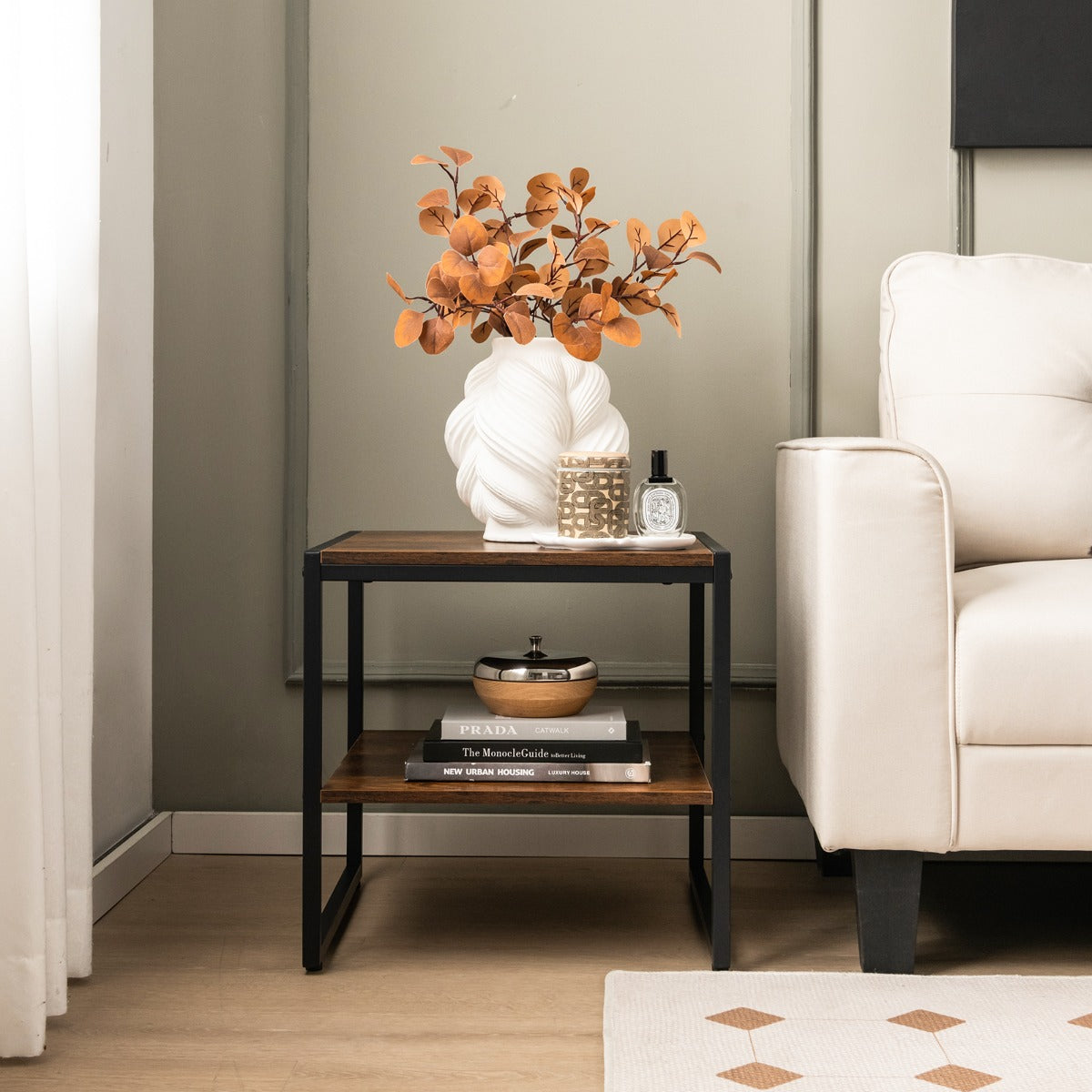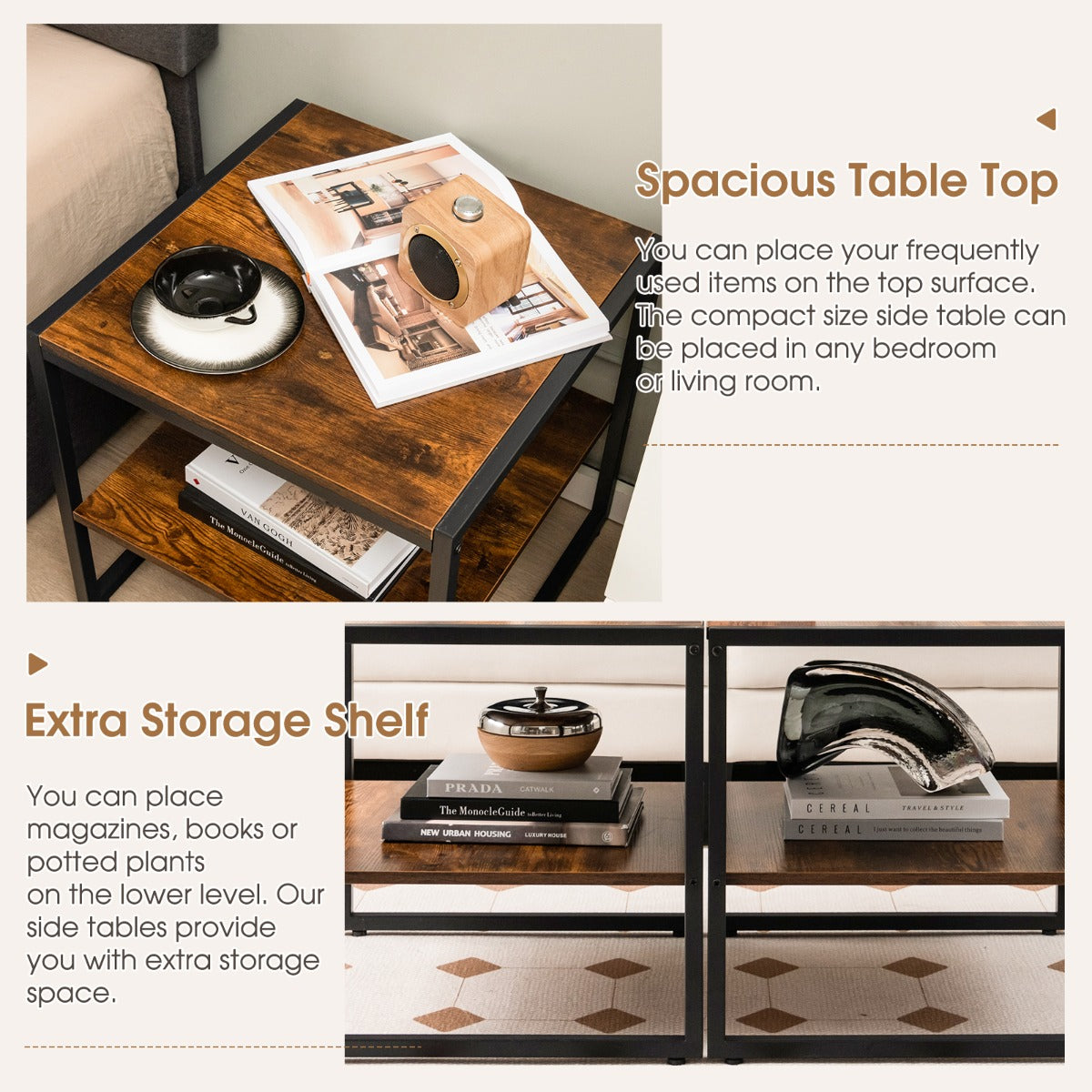 Spacious 2-Tier Storage Capacity: The industrial end table features a 50" square tabletop and an open storage shelf, offering ample space for storage and display. The spacious tabletop is suitable for holding lamps, cups and photos, while the lower shelf adds to the storage space for baskets, magazines and plants.