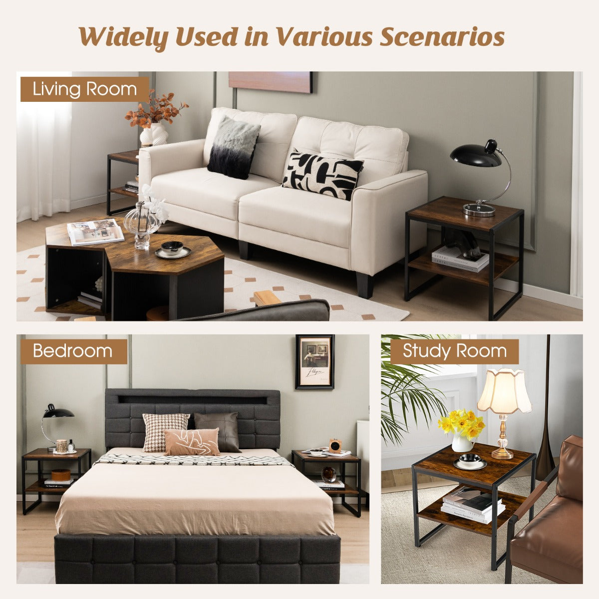 2 PCS Multifunctional End Tables: Thanks to the functional storage space and sturdy construction, the sofa table set is a versatile addition that you can explore the endless possibilities of usage. It is not only an end table but also a mini fridge stand, a printer stand, a turntable stand, etc.