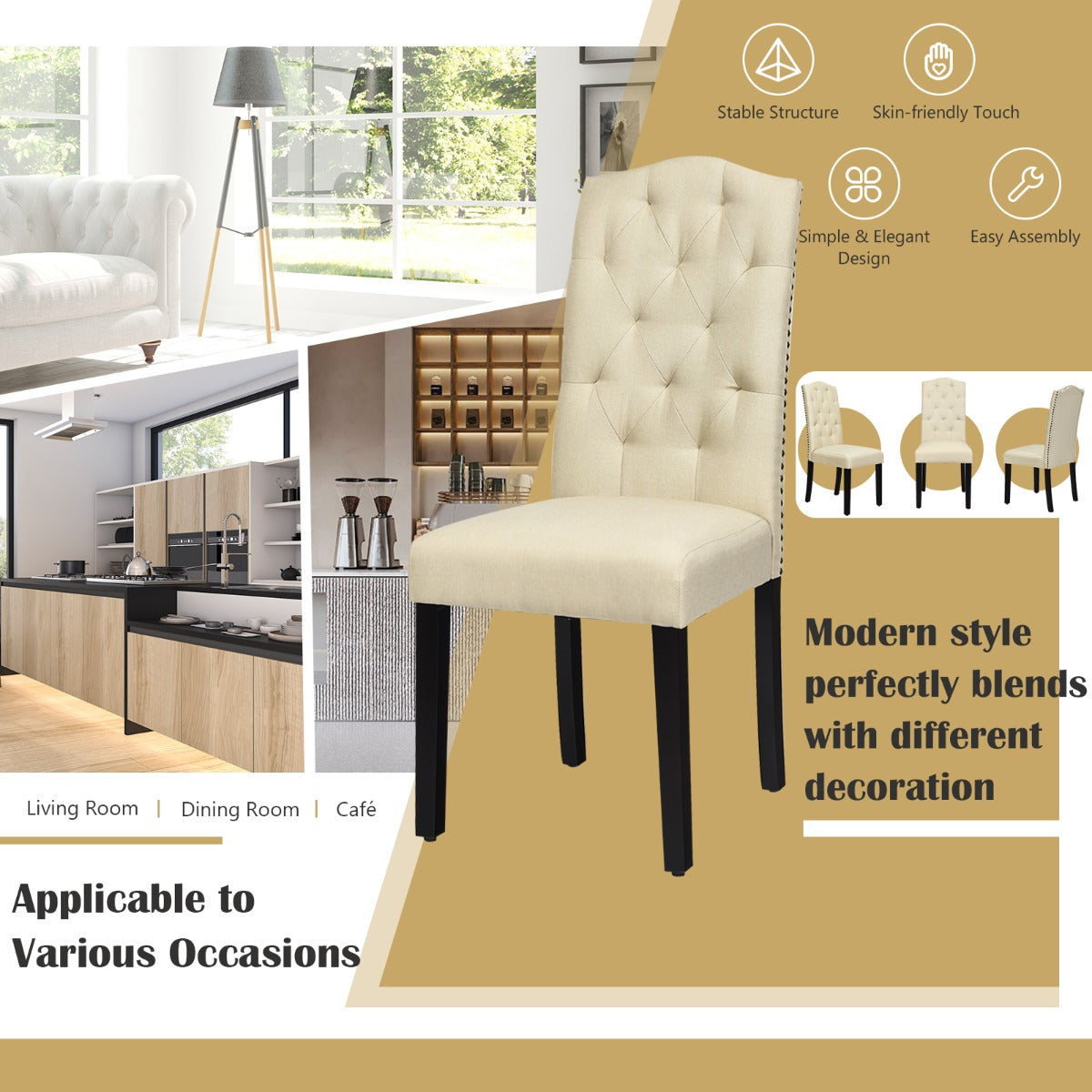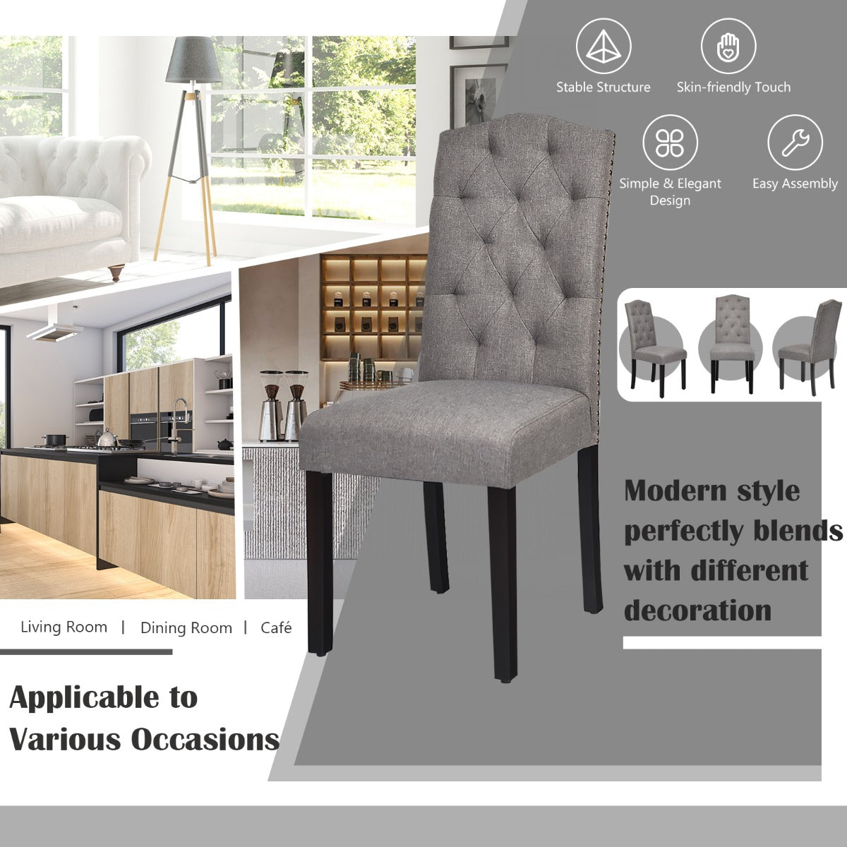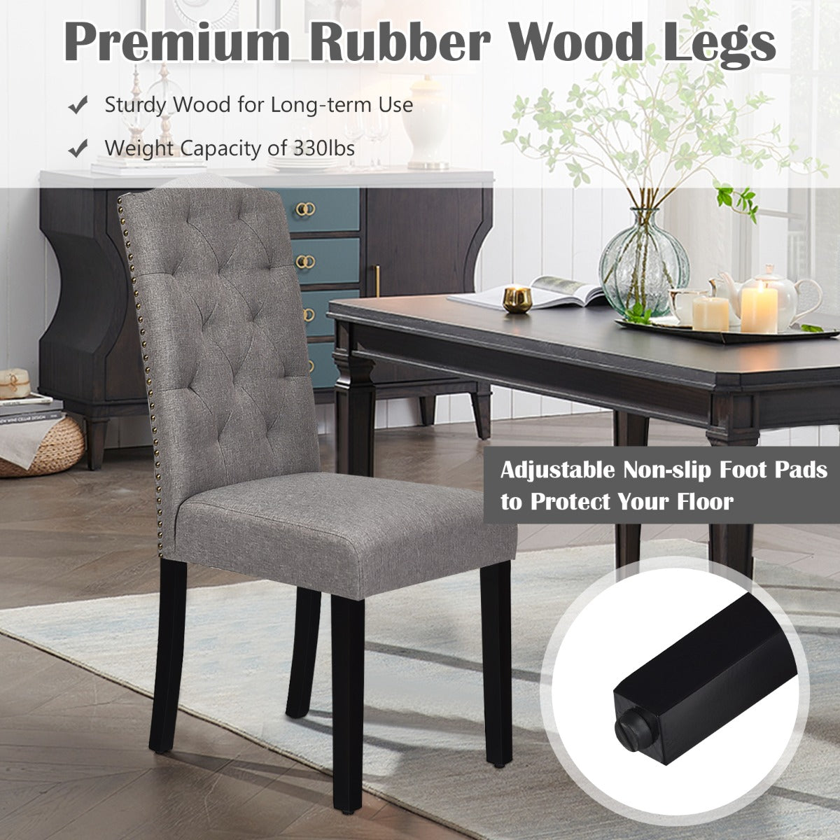 Stylish Design for Versatility: Exquisite tufted back and rivet design around the seat will add a sense of luxury and beauty to your home. With a simple and elegant style, this dining chair set is compatible seamlessly with any décor. It is perfect for your kitchen, dining room, restaurant, café and more.