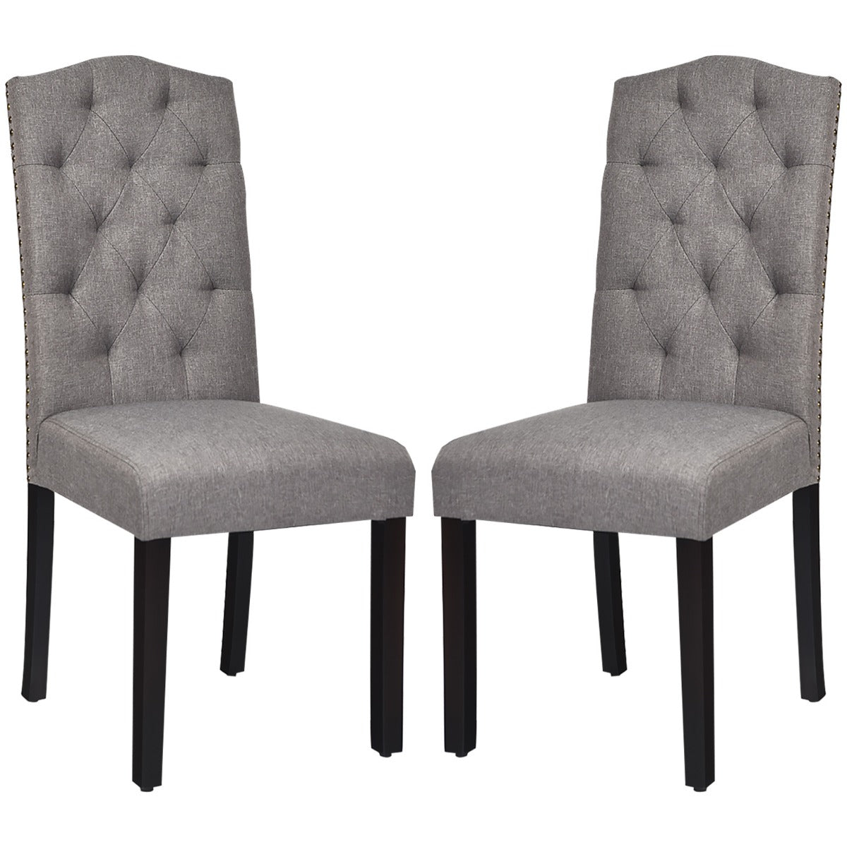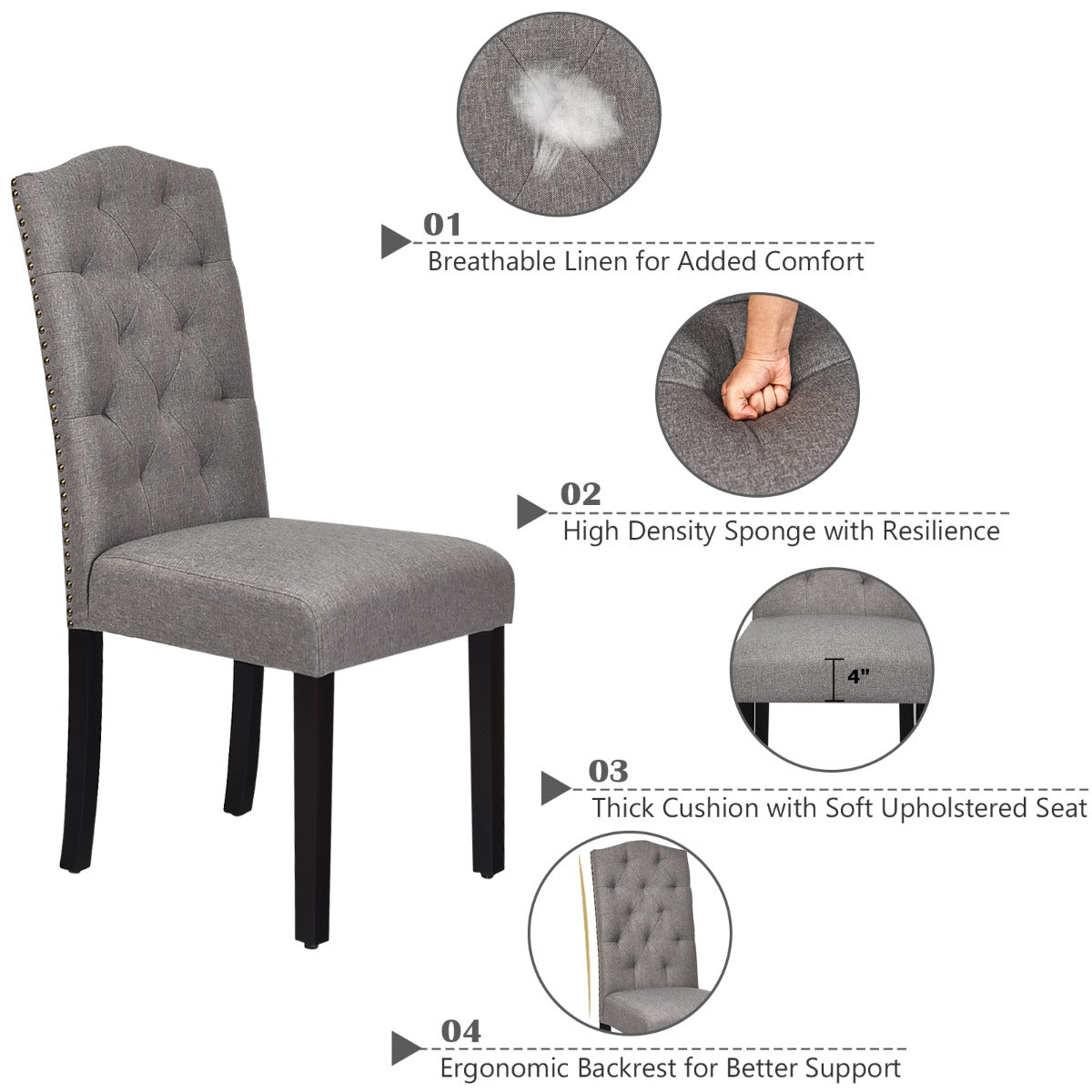 Covered with breathable linen fabric, these chairs provide a comfortable and skin-friendly feeling. And wide seat padded with a highly elastic sponge offers optimal softness and comfort. The high-curved backrest is ergonomically designed for relieving back fatigue. What's more, sturdy rubber wood legs and solid connection ensure the structure is stable and durable for a long lifespan. The delicate tufted back and rivet design will add a touch of modernity and elegance to your room. A good place to sit down and enjoy leisurely afternoon tea.
