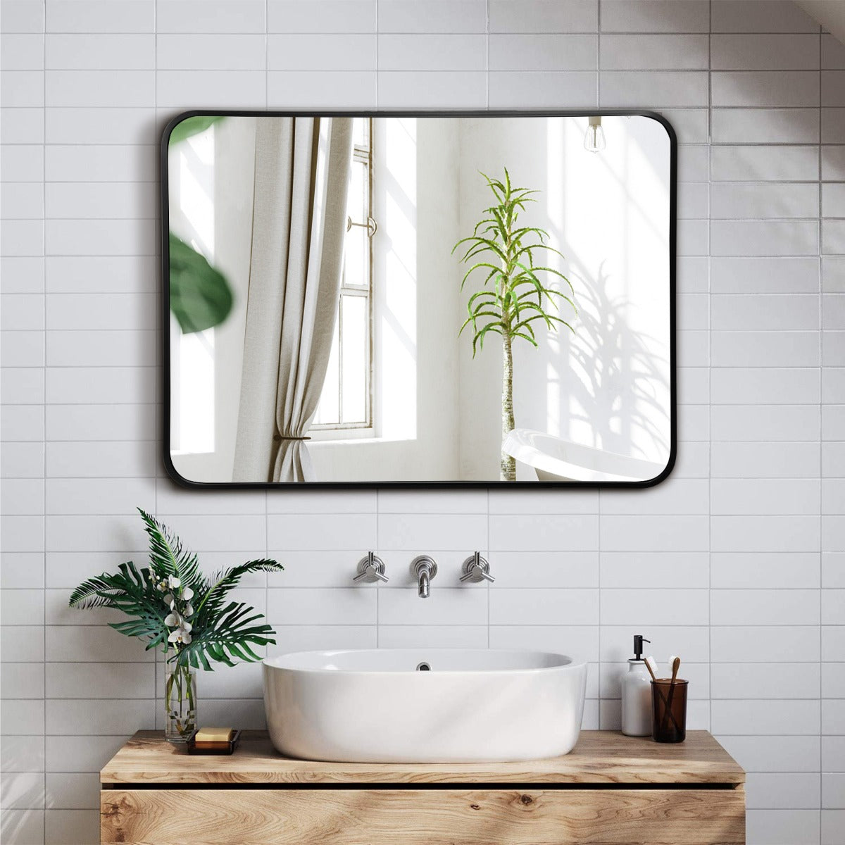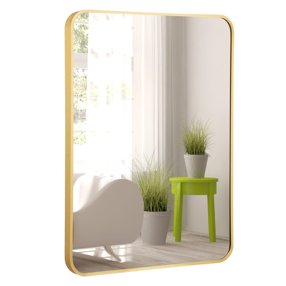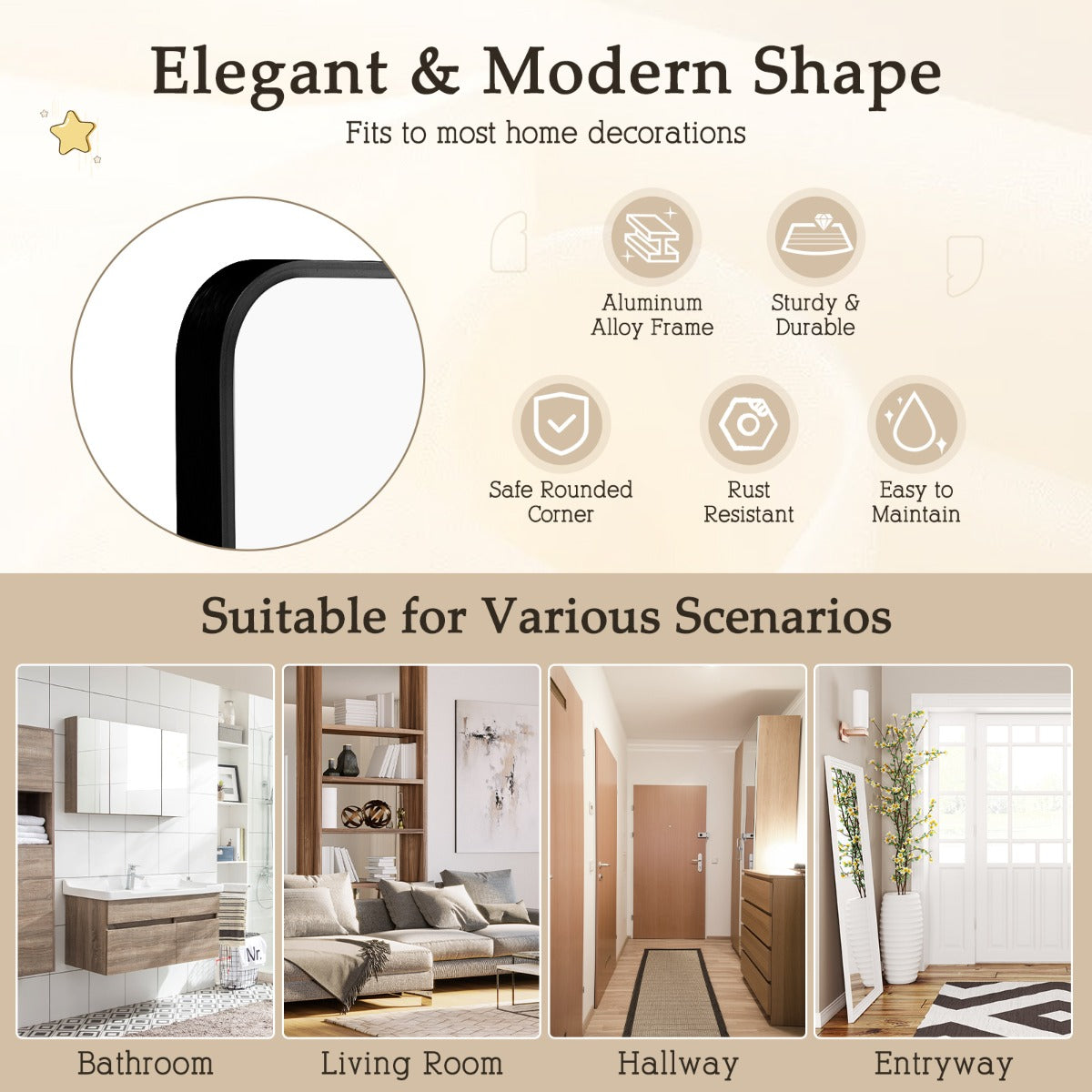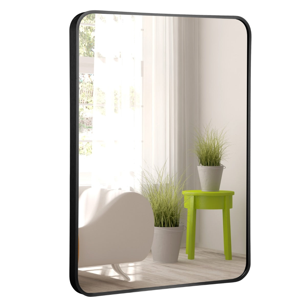 Premium & Durable Materials: This rounded rectangular wall mirror is made of 4 mm glass with protective paint layer. Moreover, the glass is surrounded by rustproof aluminum alloy border. And all the accessories needed are also rustproof. Hence, this metal framed wall mirror is suitable for the bathroom environment.