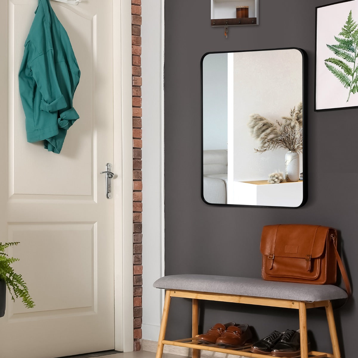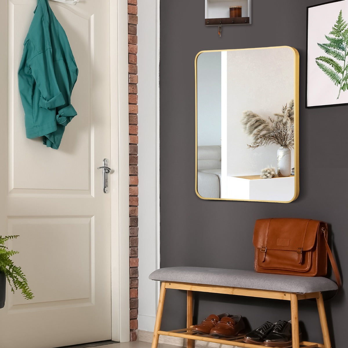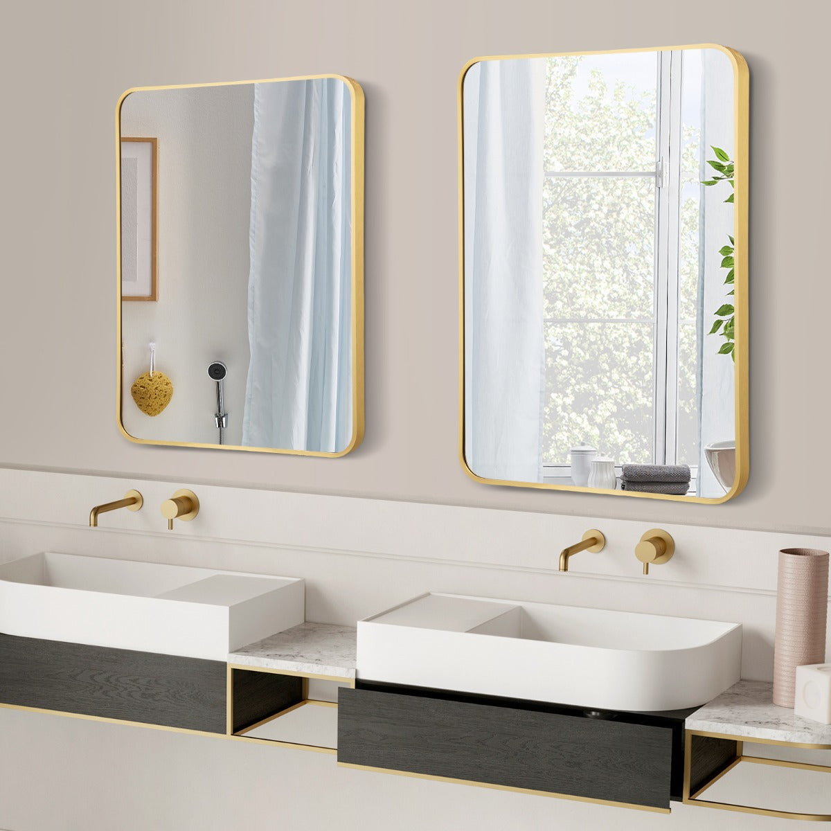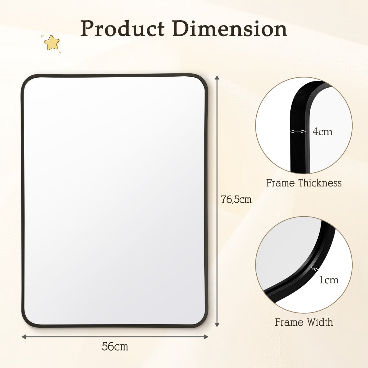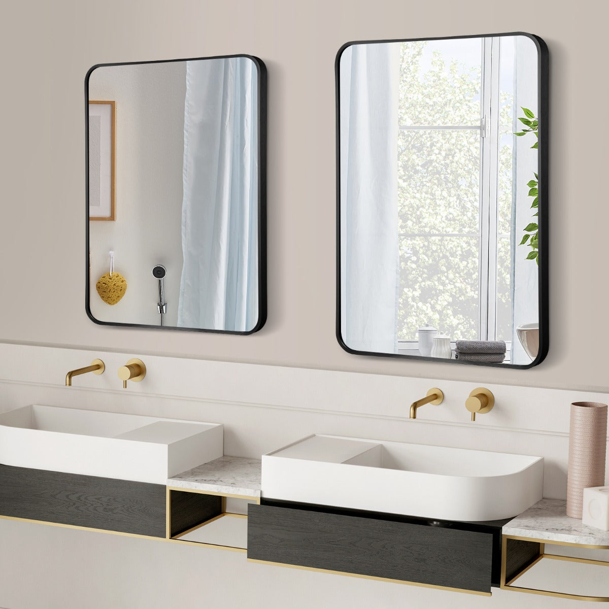 Premium & Durable Materials: This rounded rectangular wall mirror is made of 4 mm glass with protective paint layer. Moreover, the glass is surrounded by rustproof aluminum alloy border. And all the accessories needed are also rustproof. Hence, this metal framed wall mirror is suitable for the bathroom environment.