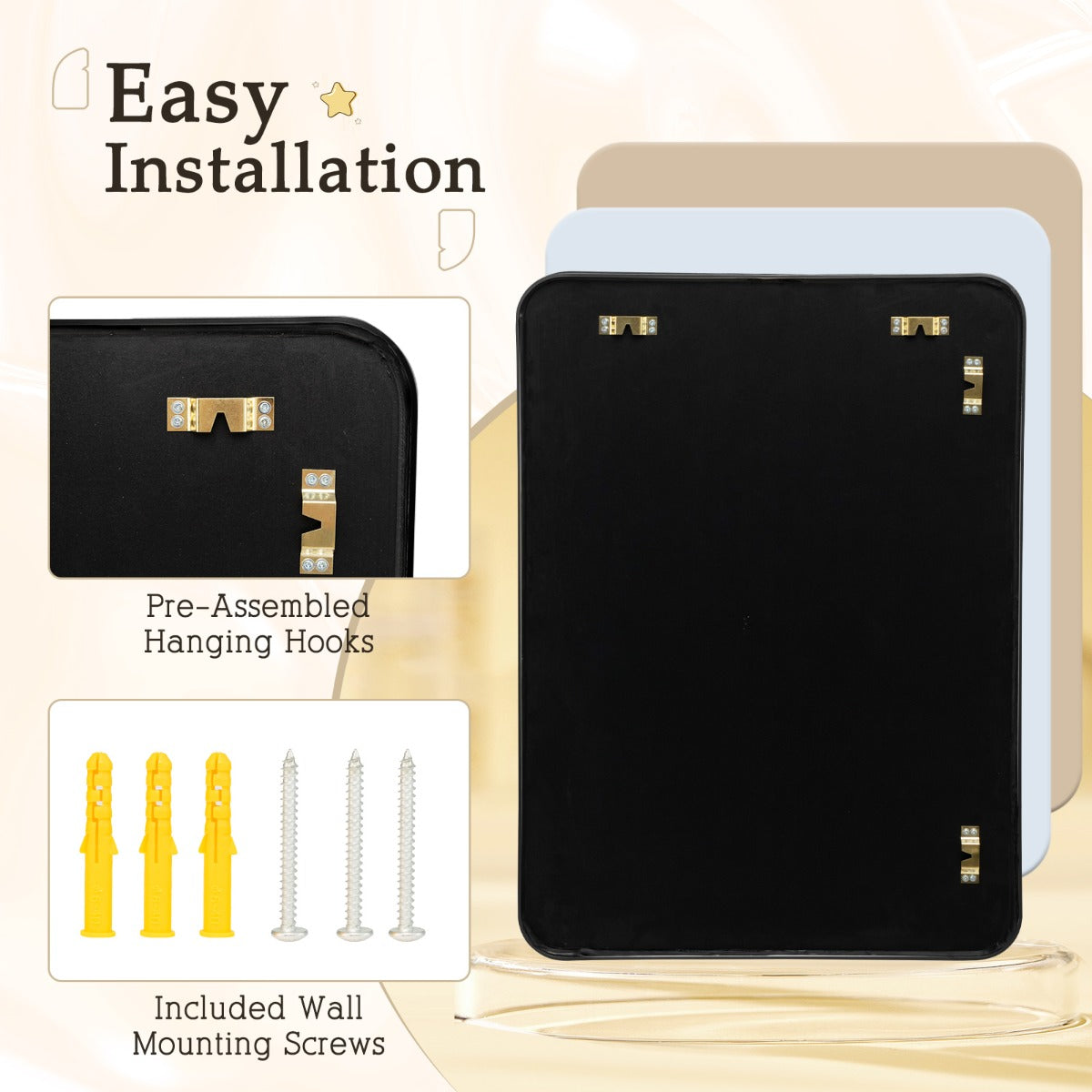 Easy to Assemble: Coming with a detailed and illustrated instruction as well as all required accessories, the metal framed bathroom wall mirror is not so hard to assemble. In addition, the smooth and clear surface makes it easy to clean with a rag for great convenience.