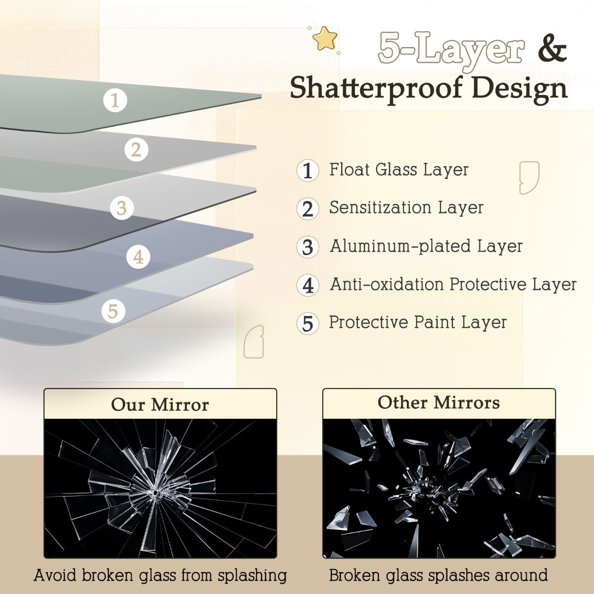 Safe Bathroom Mirror: This rectangular bathroom mirror is designed with rounded corners, avoiding hurting your hands when you are using it. More importantly, the mirror is shatterproof, which can prevent the glass from scattering when it is broken accidentally. Therefore, you can use this bathroom mirror with confidence.