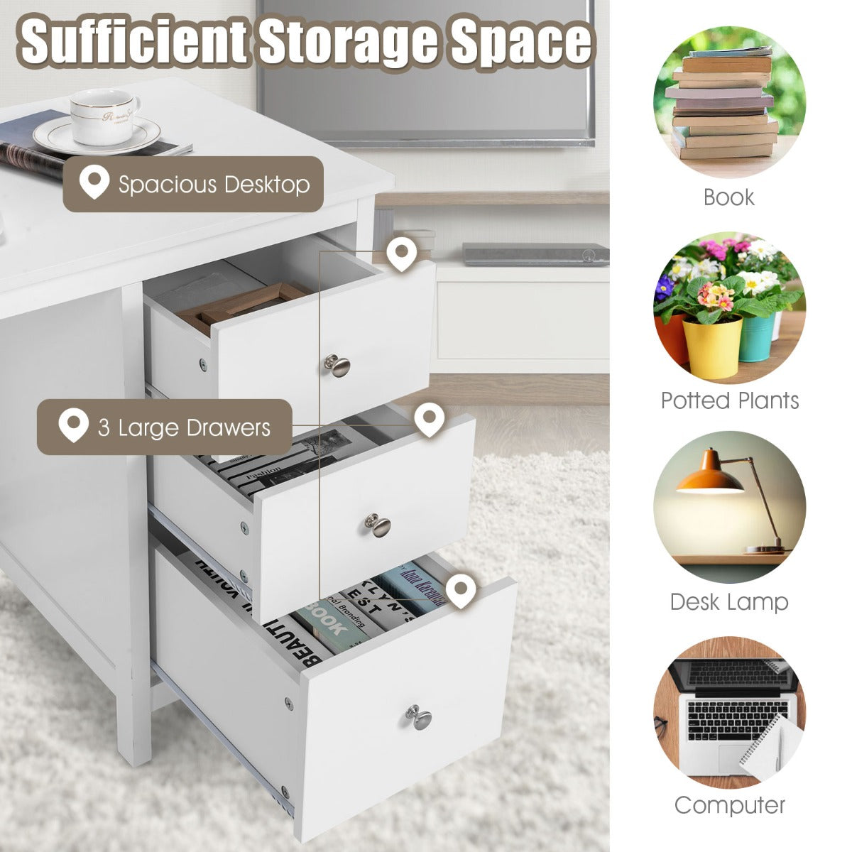 3 side drawers for placing office, study supplies and personal items