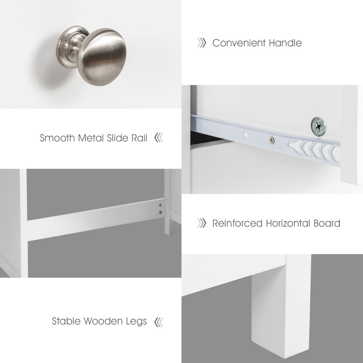 Round knobs as well as metal slide rails help to easily open and close the drawer