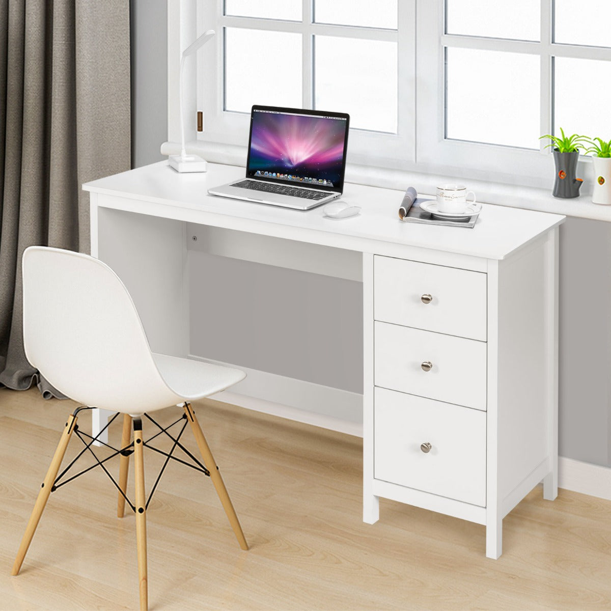Made of durable MDF, the computer desk is sturdy and reliable for long service time. Coming with 3 large drawers, it provides enough storage space for computers, books, and other office supplies. Also, the office desk is designed with spacious tabletop to ensure optimal workspace and keep your daily essentials in order. With simple but elegant design, it is a perfect complement to your house and office. Besides, it is an ideal choice whether you need a spot to study, dress up or finish important work!