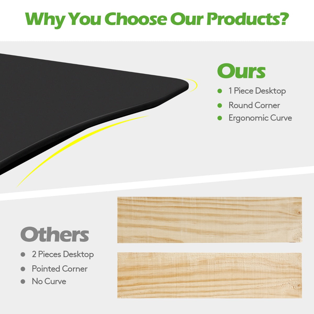 Spacious and Ergonomic Desktop: The large single-piece desktop offers a spacious working area and plenty of room to hold your monitors, laptops, books, etc. In addition, the ergonomically curved shape on the edge allows you to get closer to the monitor and the round corners can effectively prevent the dangers of crash injury.