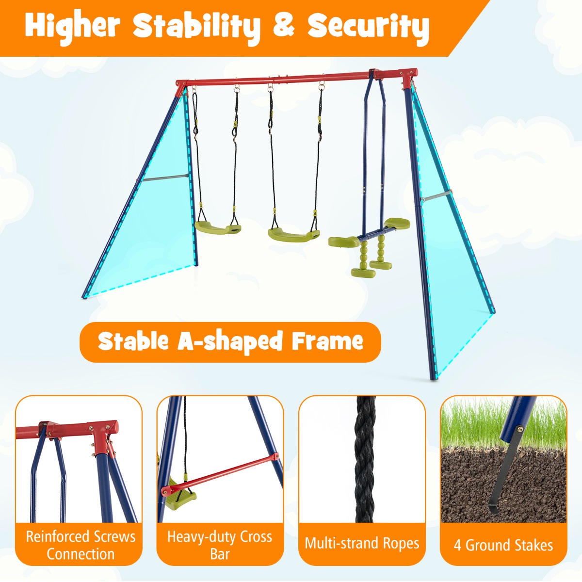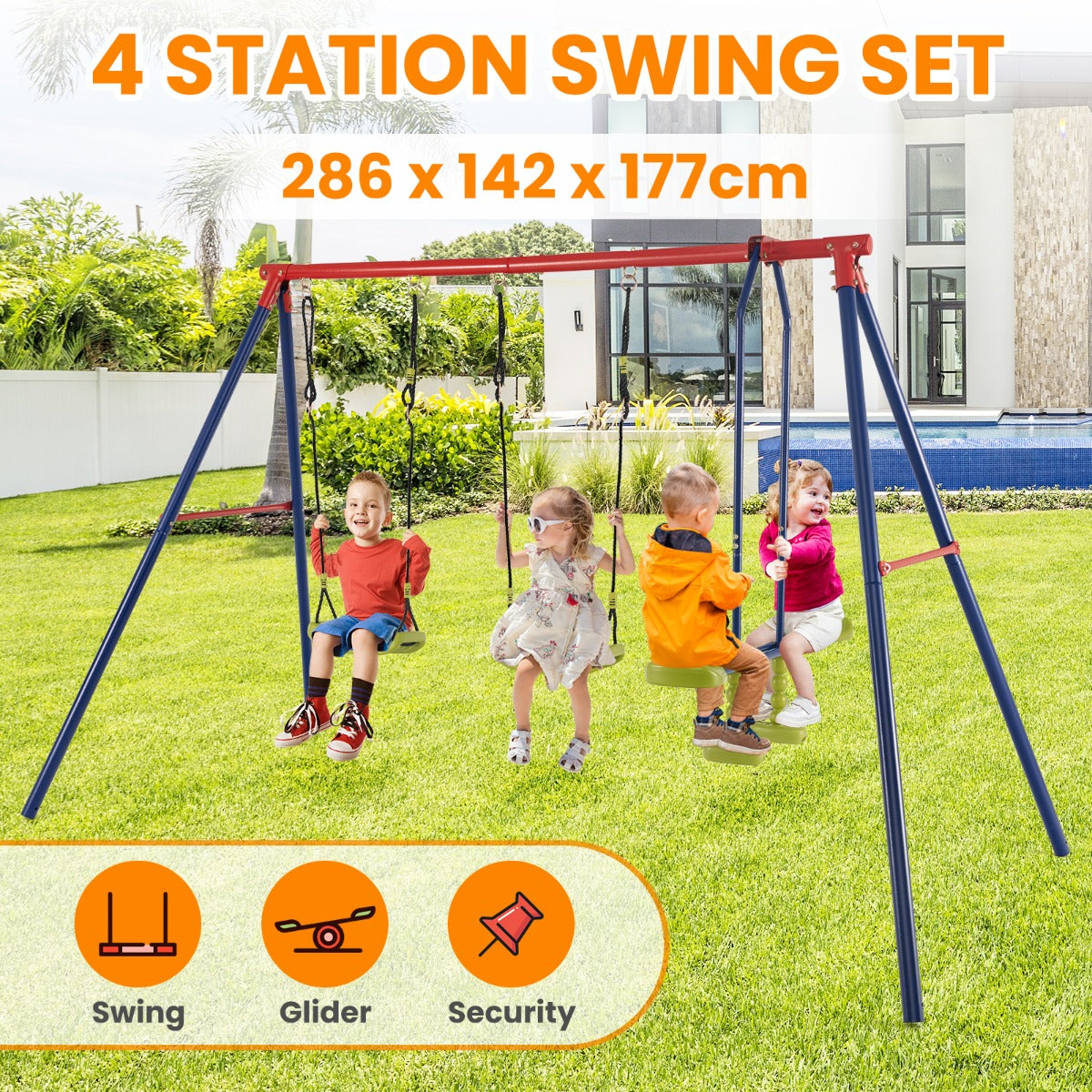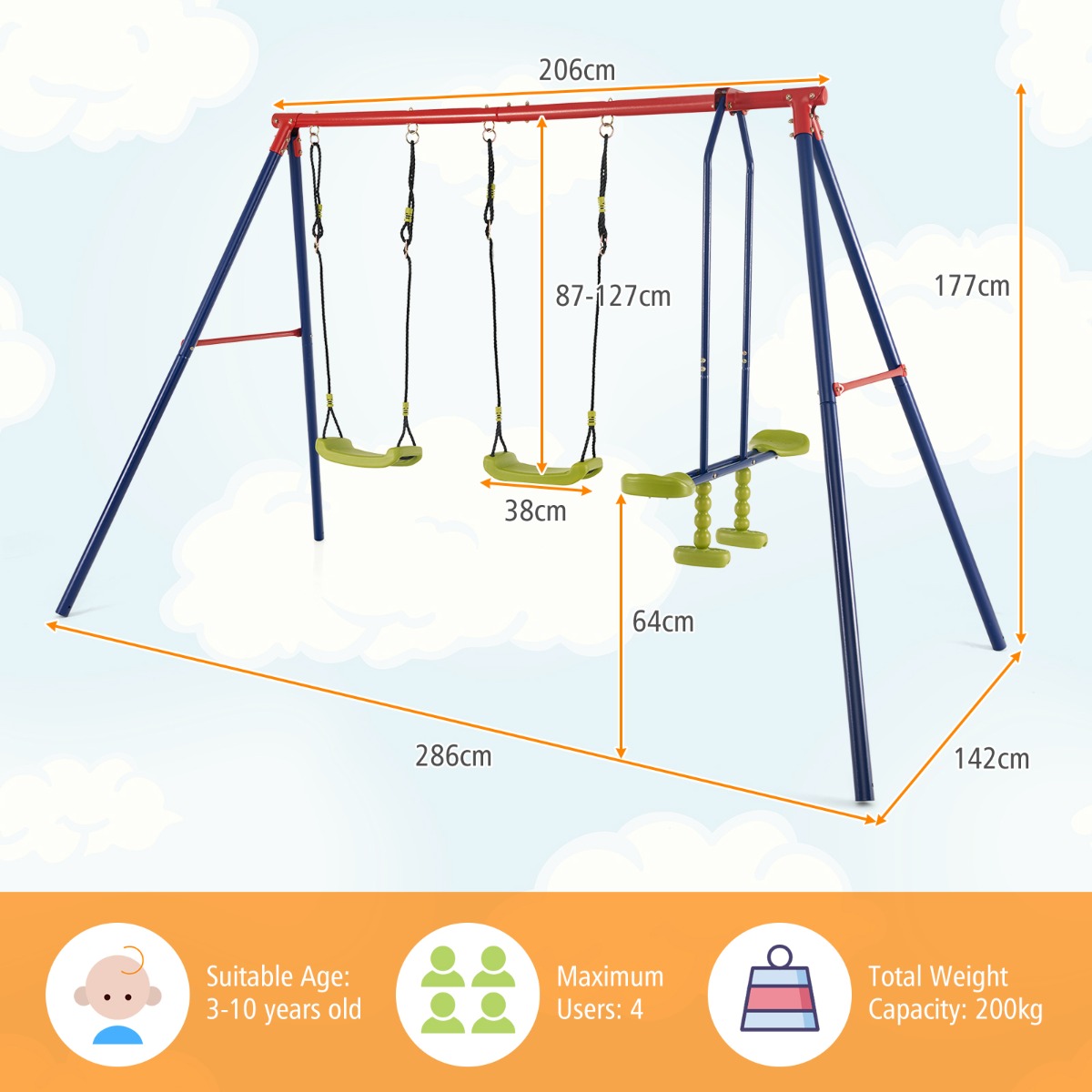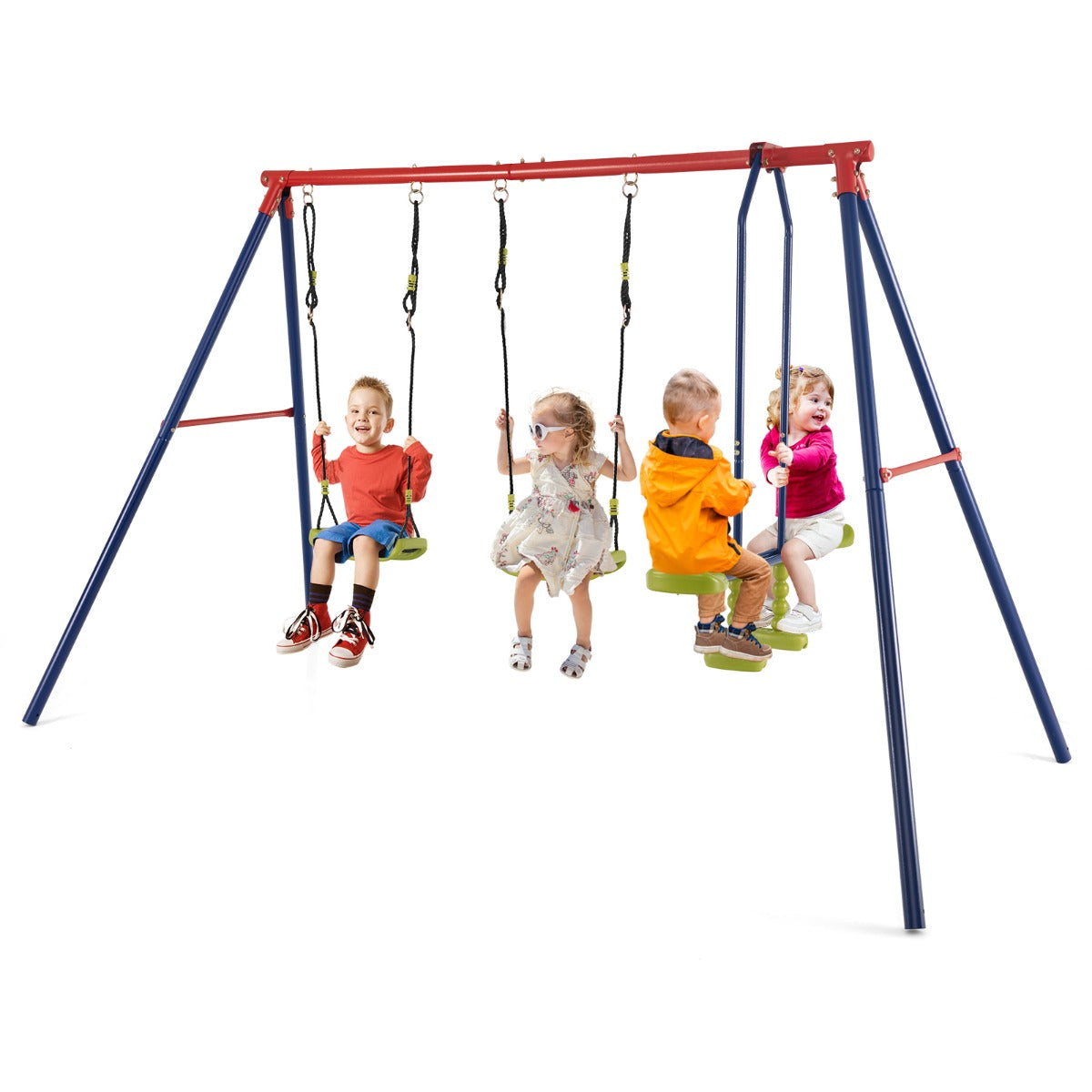 This 2-in-1 multifunctional swing set will be a perfect gift for boys and girls aged 3 - 10. Equipped with two swings and one 2-person glider, this kids swing set allows 4 kids to play together. Thick steel tubes with...View More