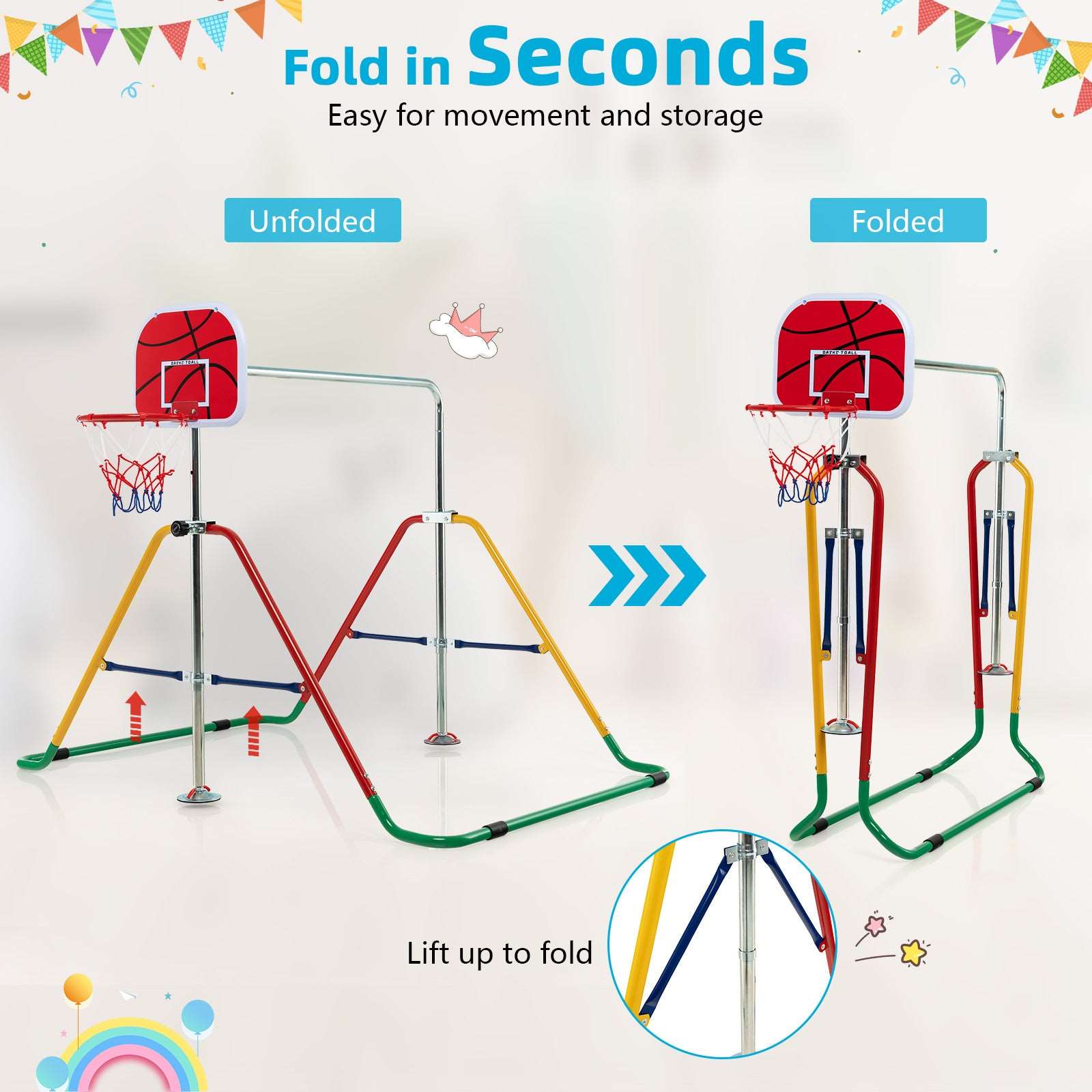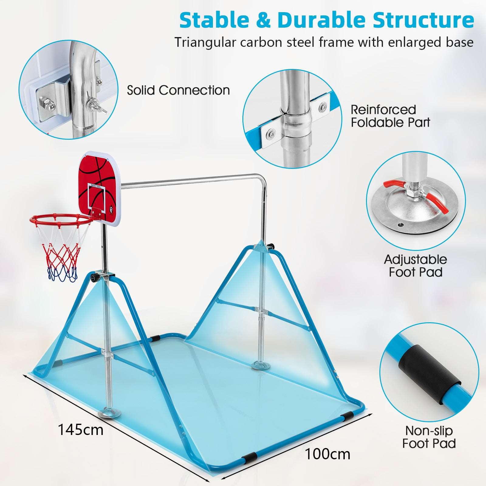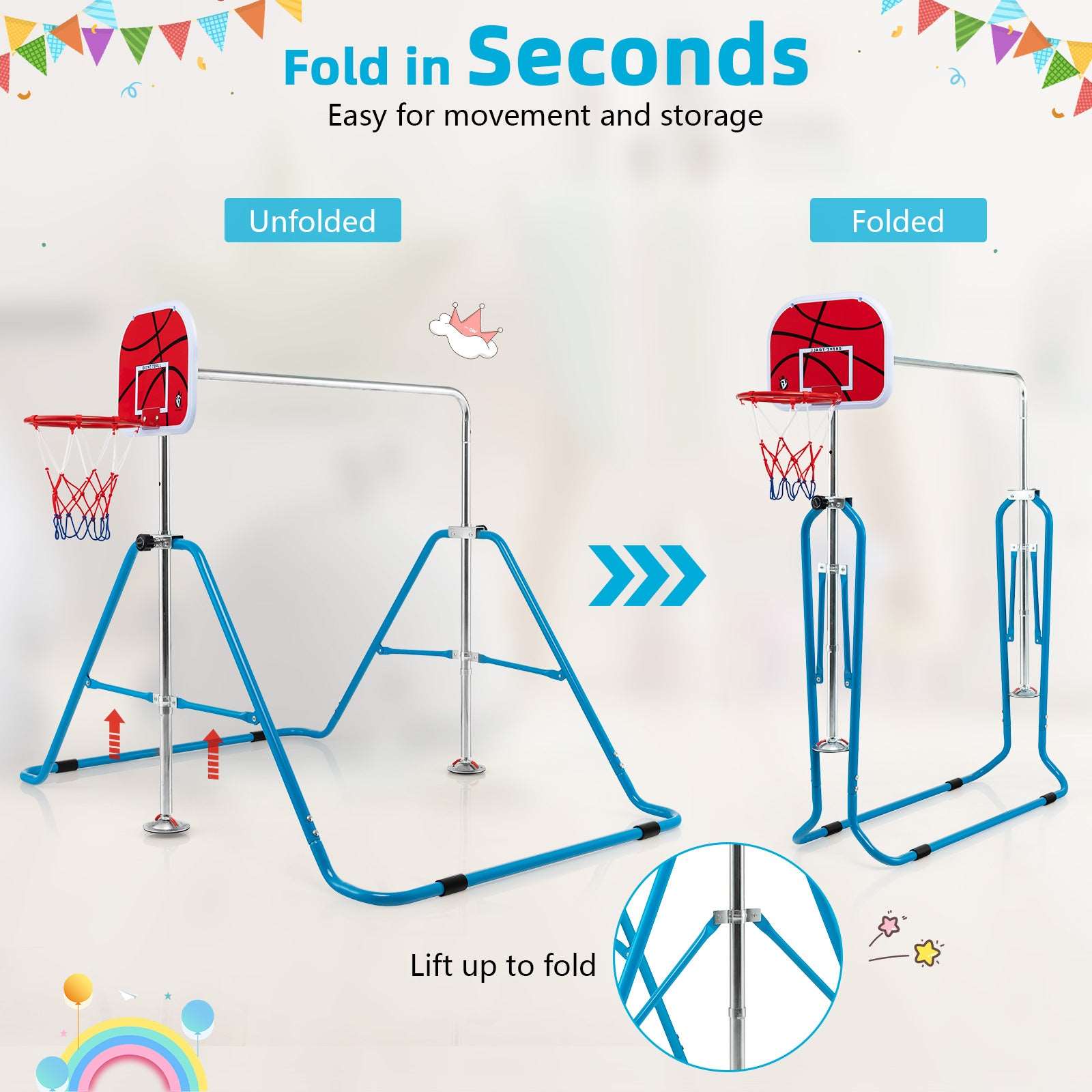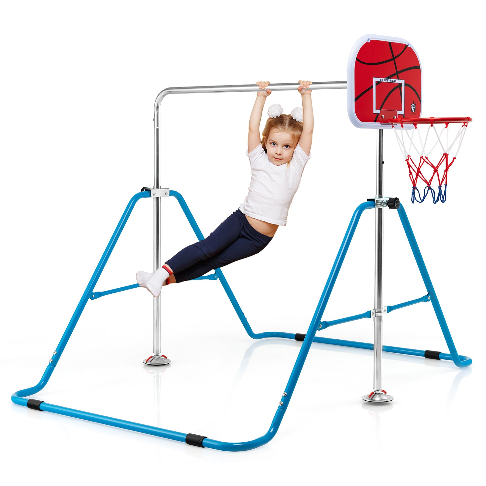 This indoor gymnastics equipment combines a horizontal bar and a basketball hoop, offering endless fun to kids and promoting growth during happy exercise. The gymnastics bar is made of high-quality carbon steel and constructed in a stable triangular structure, which ensures firm support and reliable safety during use. The non-slip foot pads also add extra security. 4-level adjustable height meets kids' needs from 3-12 years old. This horizontal bar is quick to expand and fold, convenient for storage and transport. With step-by-step instructions, the assembly is easy and quick. This home gymnastics equipment is an ideal gift for your kids' birthday or Christmas, developing their motor skills and enhancing muscle strength.