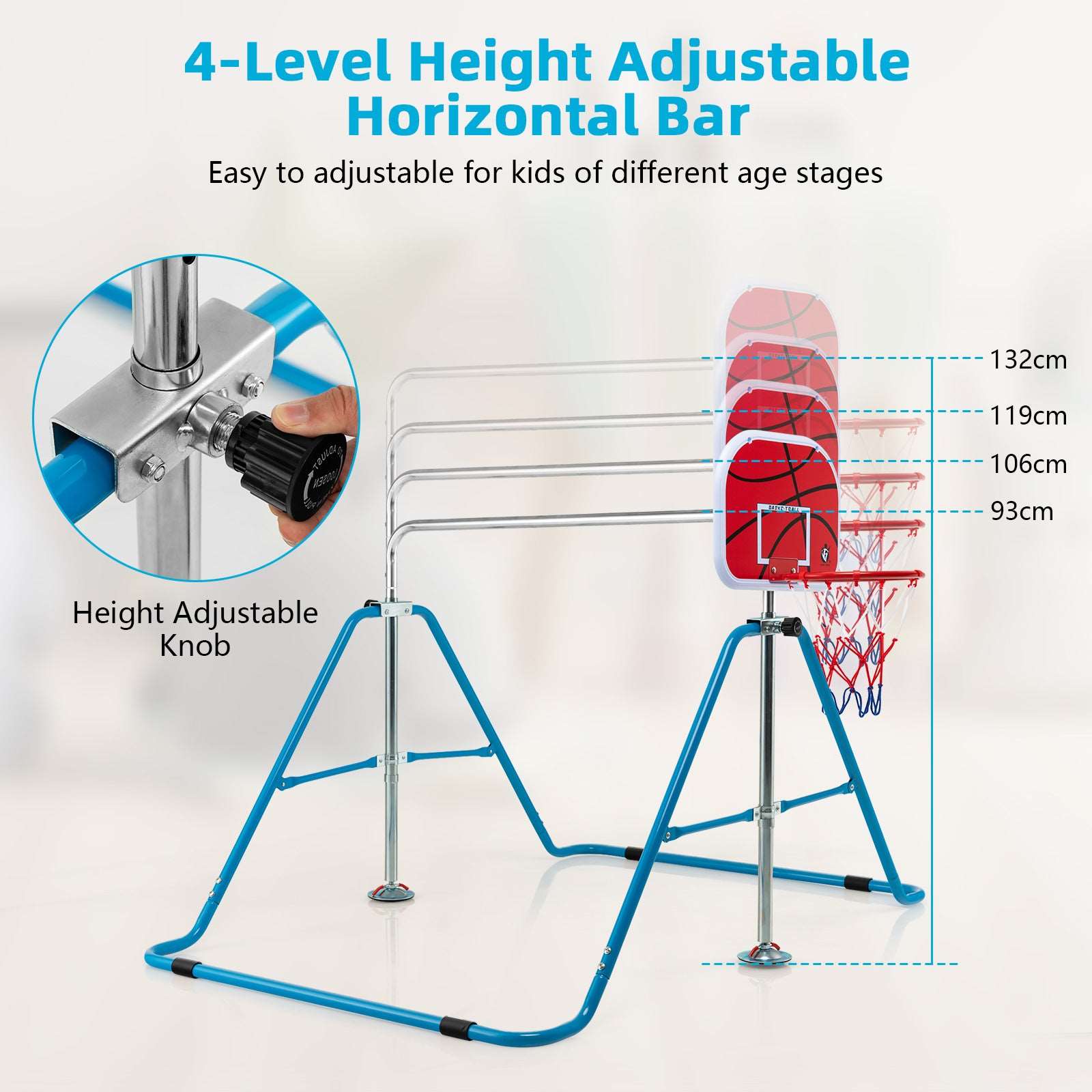 4-Level Adjustable Height: By rotating the height-adjustable knob, the height of the horizontal bar can be easily adjusted up or down in 4 levels: 93 cm, 106 cm, 119 cm, 132 cm. Thus this height-adjustable horizontal bar fits kids of different age stages and accompanies your kids to grow up.