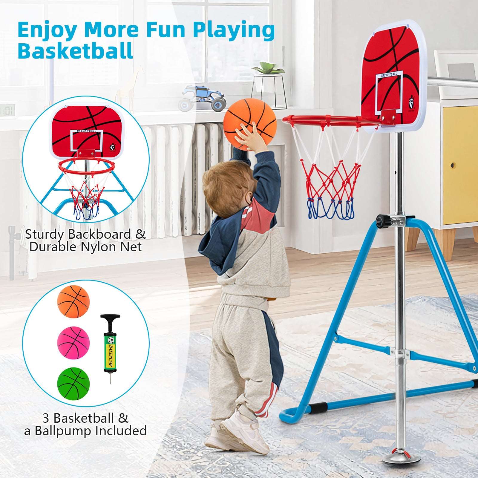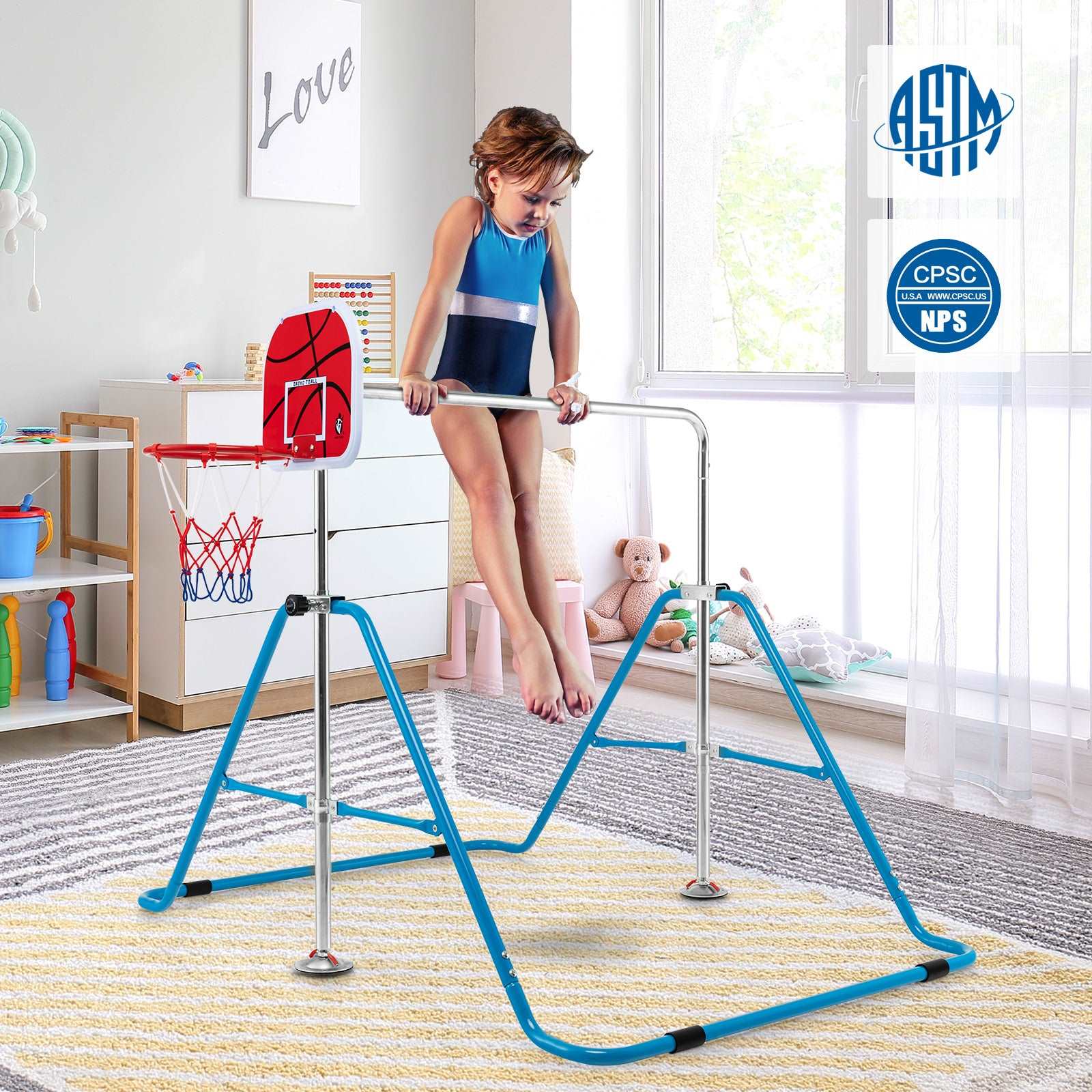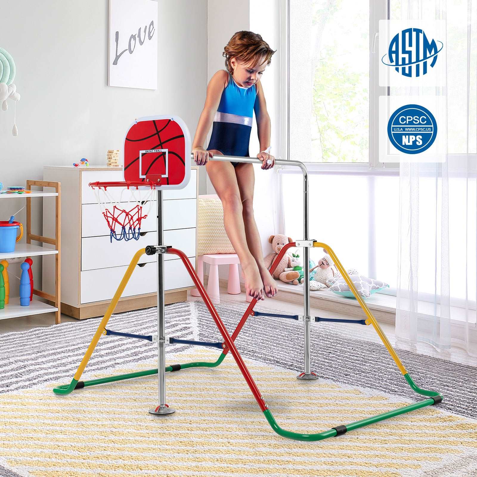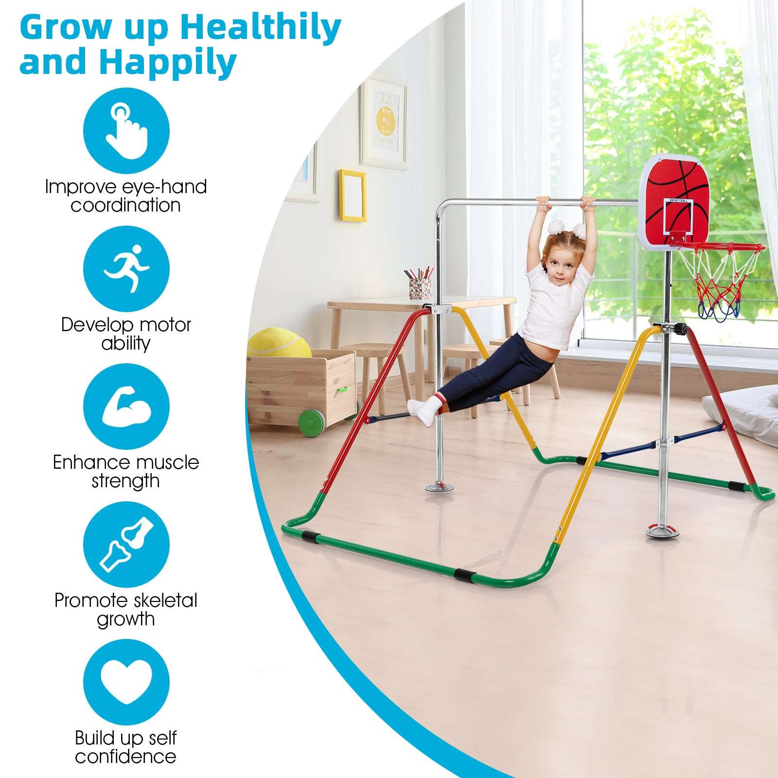 More Fun with Basketball Hoop: Our exclusive kid's gymnastics bar is equipped with a basketball hoop, which offers much more fun for kids during playing. The sturdy backboard and durable nylon basketball net ensure long-lasting service. In addition, the package includes a ball pump and 3 basketballs.