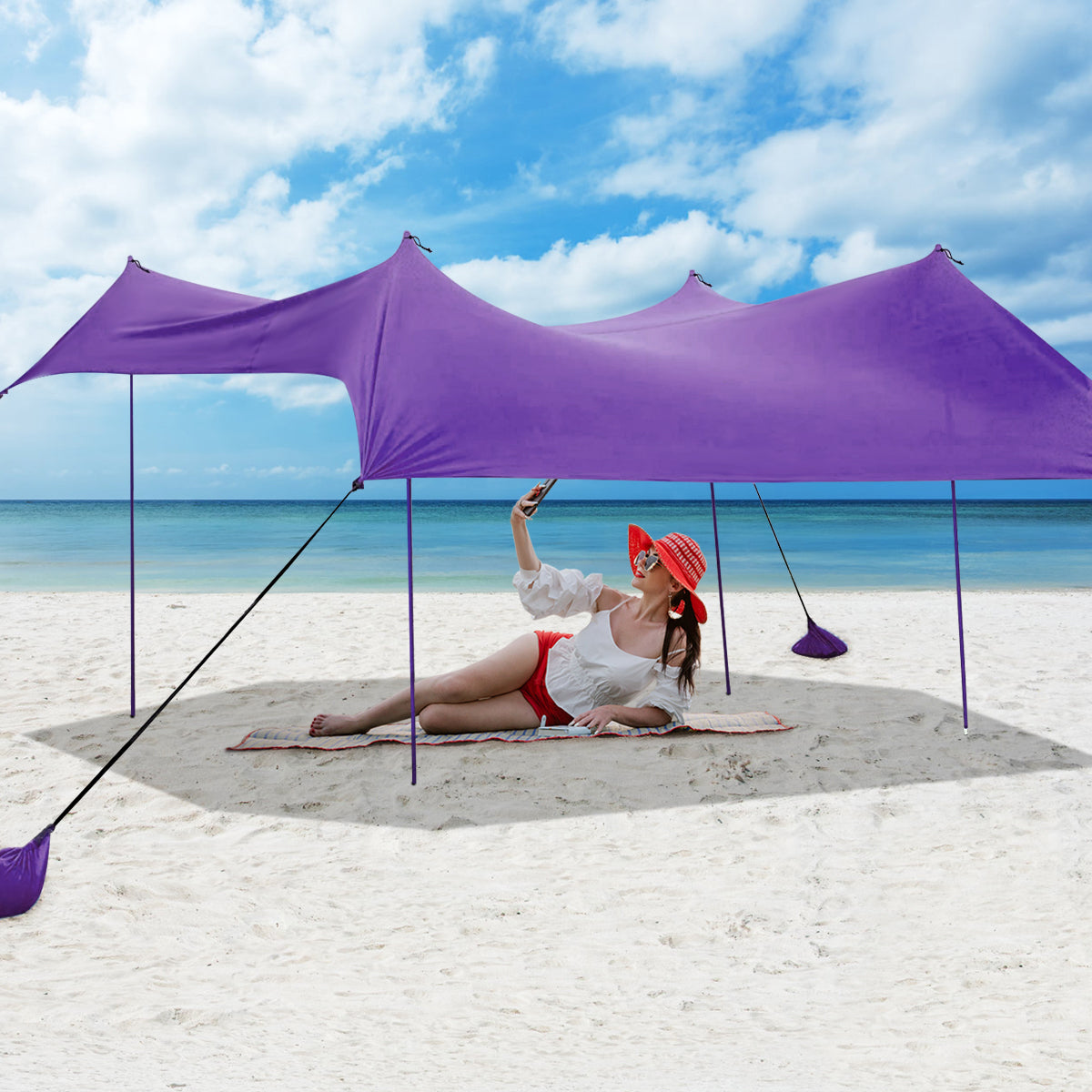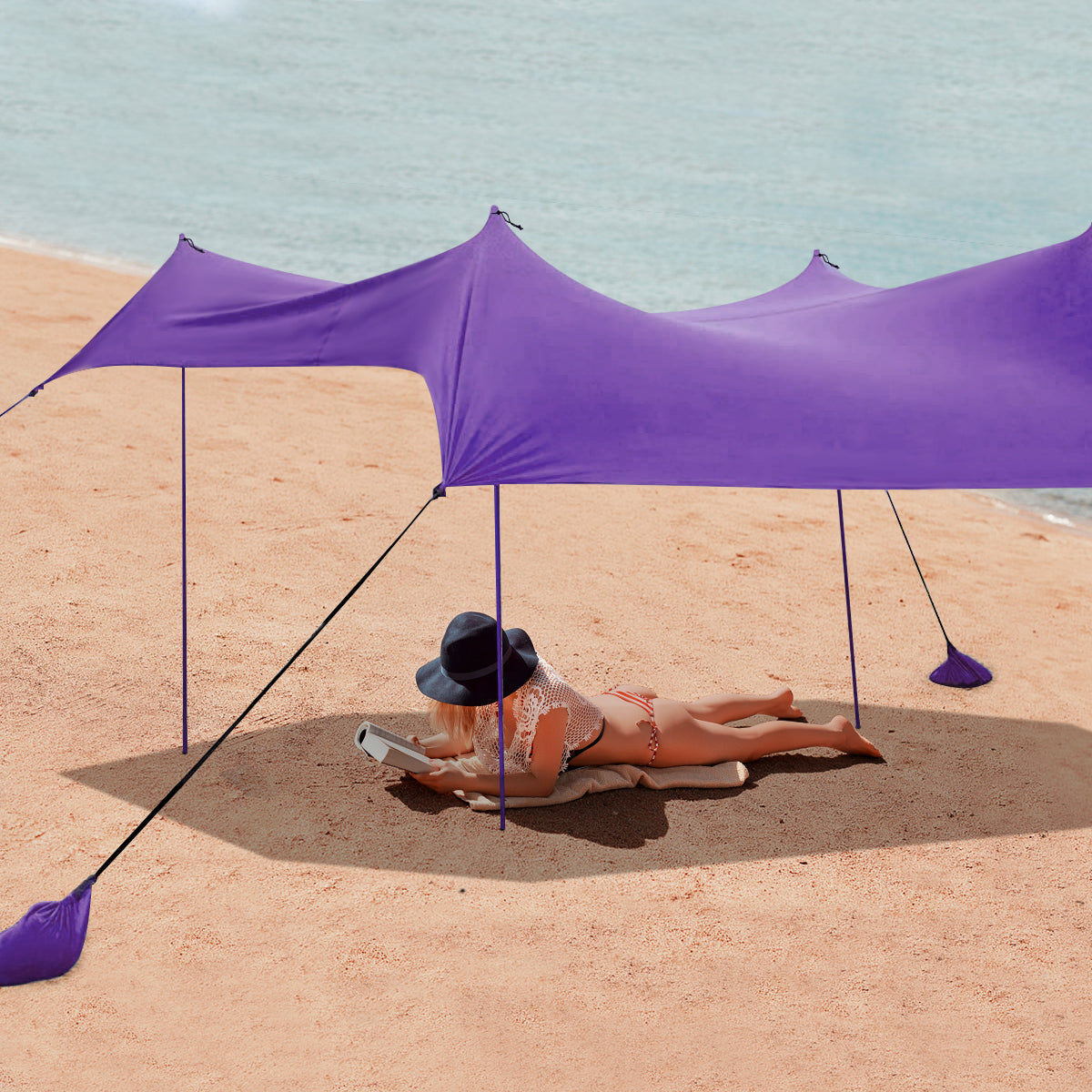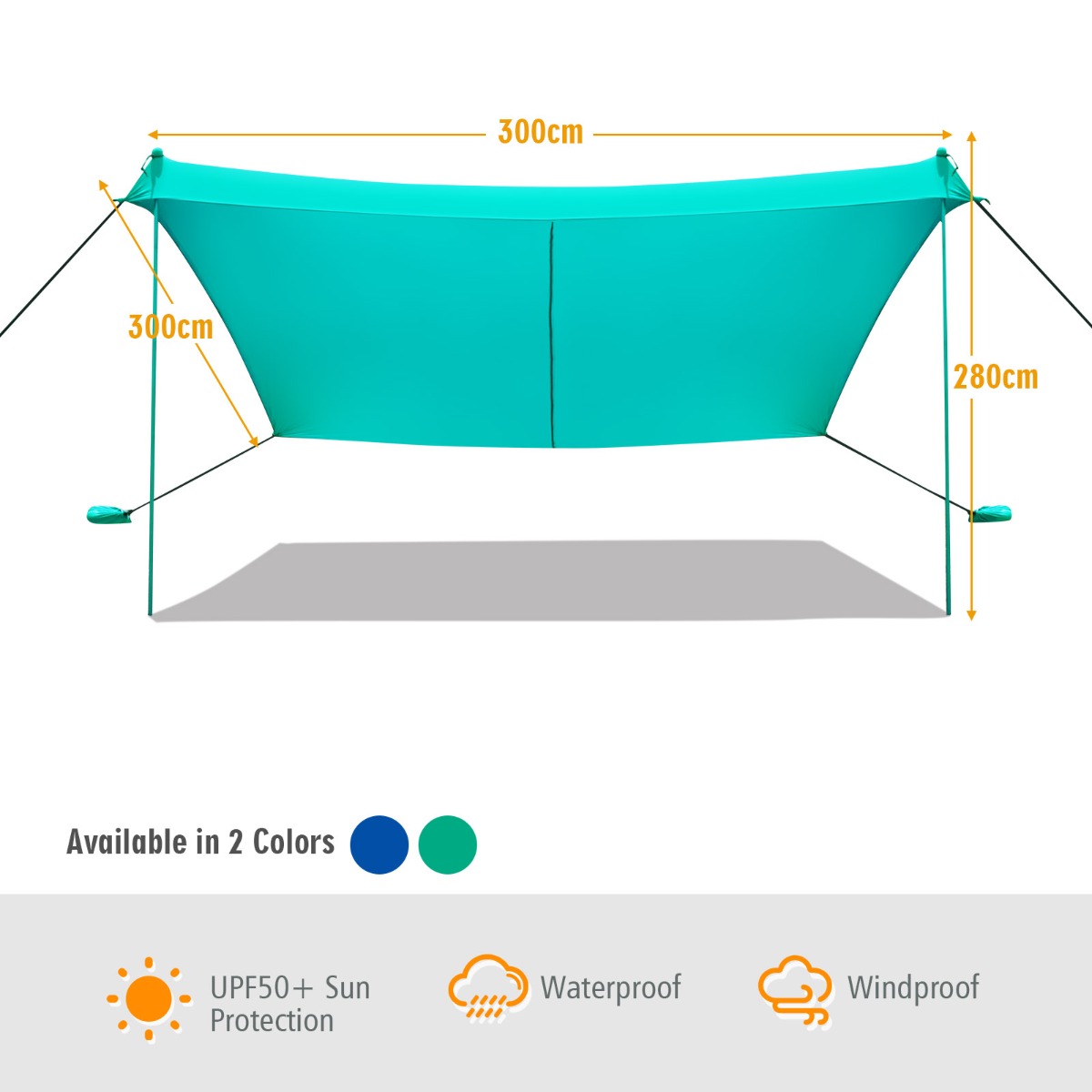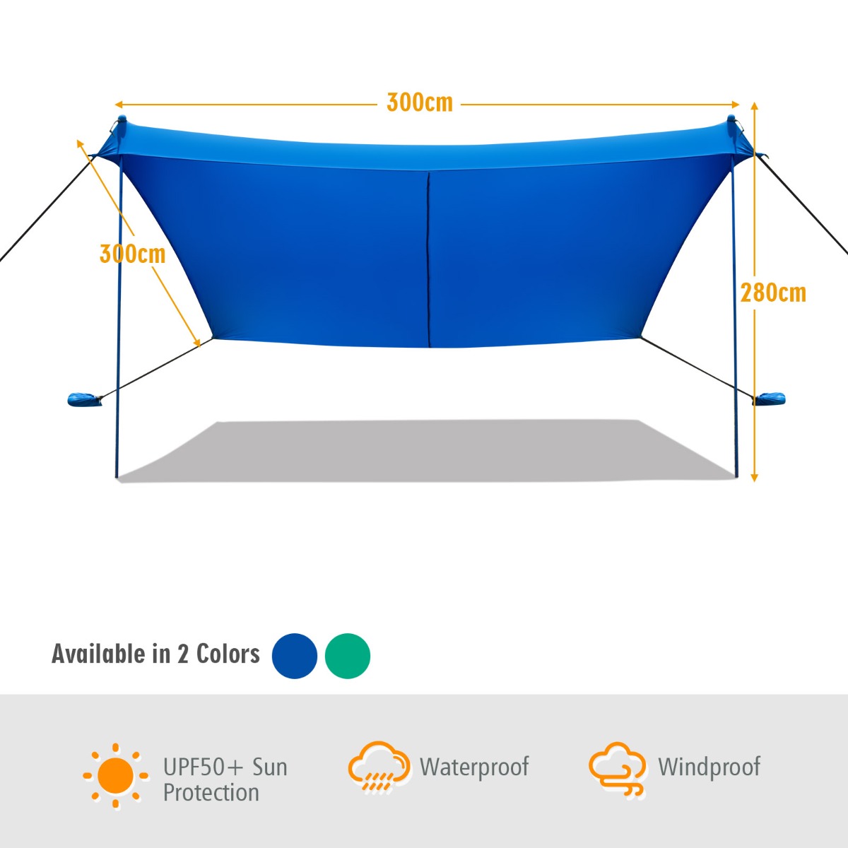 Large Sunshade Area: Designed with an idea of comfortable summer enjoyment, this beach canopy provides UPF50 Plus sun protection on hot days. Measuring 300 x 280 cm, it also provides a large sunshade area that allows 6 to 7 adults lying down effortless, which helps you create relaxing outdoor lifestyle.