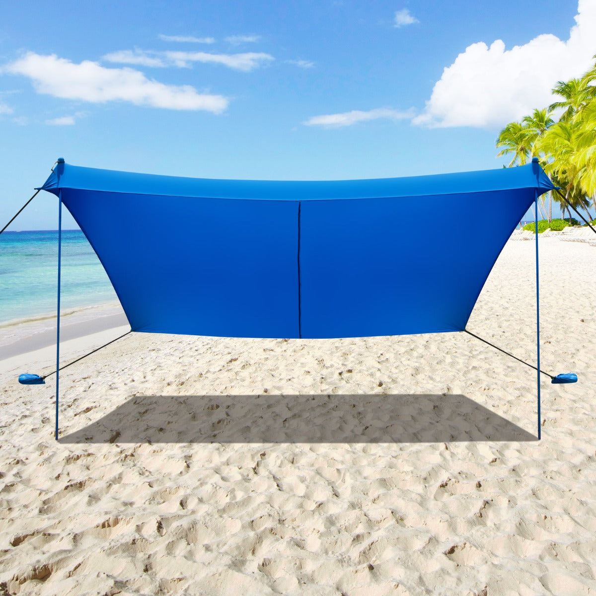 Our beach sunshade is your perfect partner helping you to have more enjoyable time. Made of high-quality fabric, it can provide UPF 50+ sun protection and prevent sunburns on hot days. This beach tent is lightweight, waterproof and wear-resistant, which is suitable for long-term outdoor use. With 4 sandbags and ground stakes, the beach tent can stand steadily on the beach or grass to prevent it from being tipping over in windy conditions. It can be packed in a waterproof bag with a zipper, bringing much convenience to take it anywhere. It is an ideal choice for beach, camping trips and picnic.