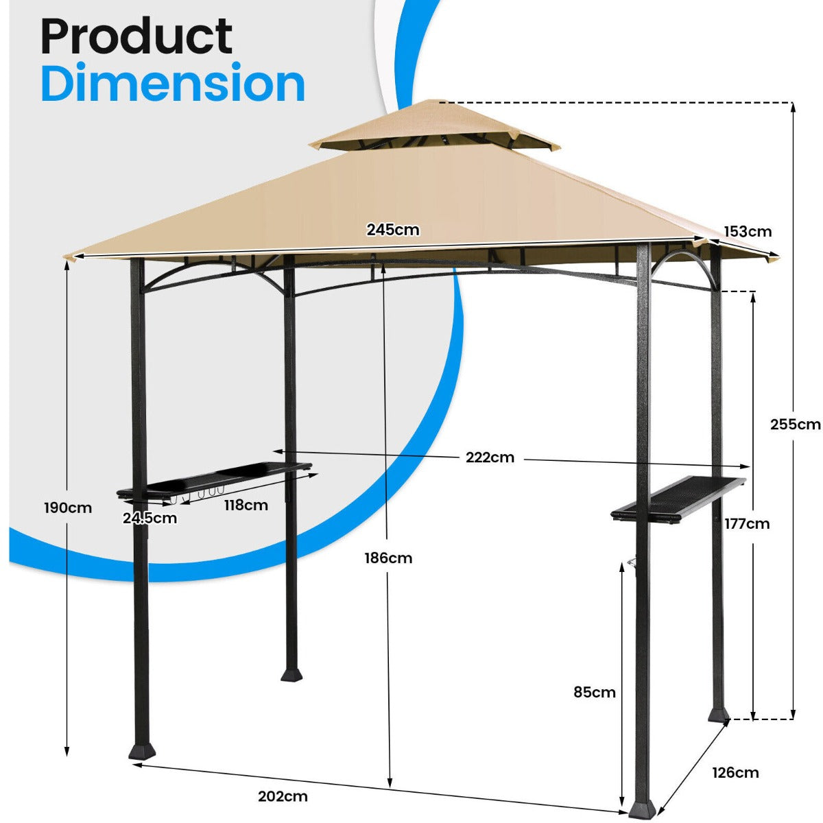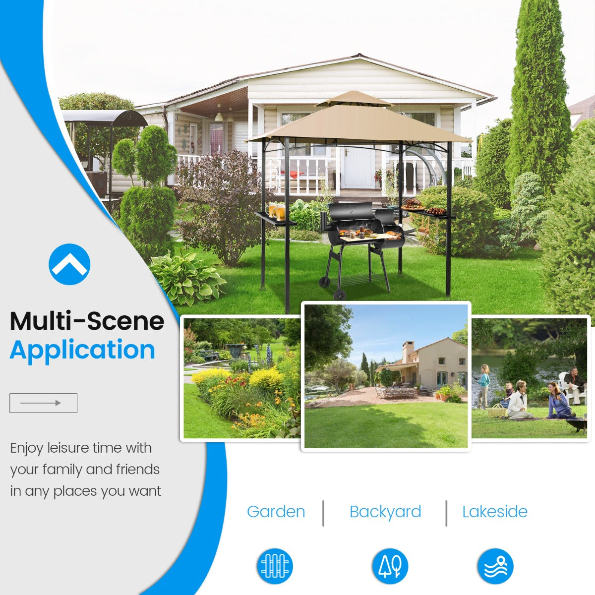 Unique Design: The grill patio gazebo comes with 2 metal ventilated shelves on both sides for placing seasoning products, dishes, utensils, food, and more. And the 5 side hooks are designed for hanging grilling tools or wipe cloth. In addition, there also exists a bottle opener on the pole for your beverage service.