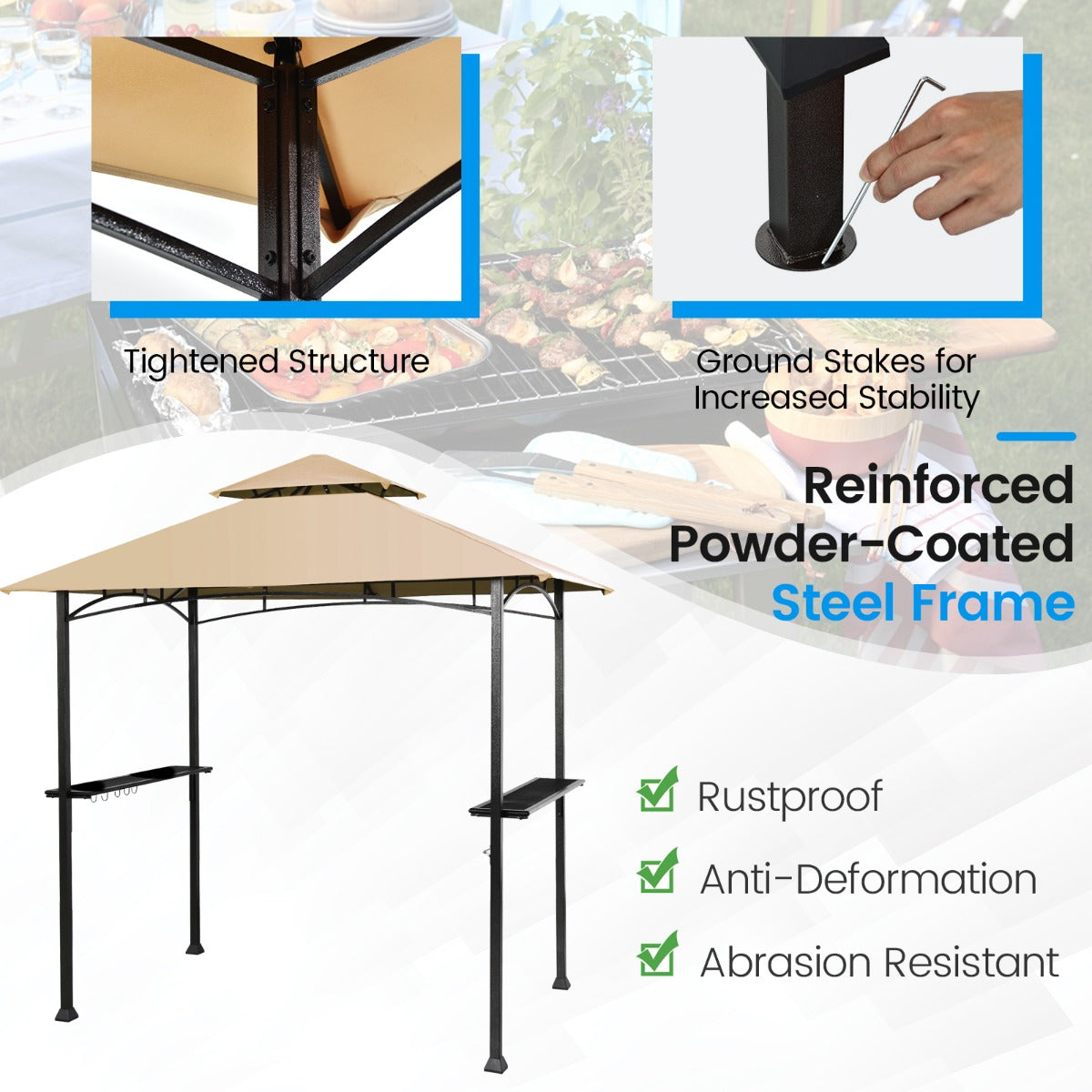 This outdoor grill gazebo creates a comfortable space for you to enjoy barbecue without scorching sunlight. Supported by a super strong steel frame, this grill gazebo possesses high stability and ensures security. And the top canopy is made of high-grade polyester fabric, which is resistant to water, fire, sunlight and tearing, ensuring long-lasting service life and protecting you from all uncomfortable elements. The shelves on the two sides and the 5 hanging hooks provide additional space for you to place food and cooking accessories. Also, the practical bottle opener allows you to immediately open your drinks. This gazebo is not only perfect for barbecue, but also an idea for picnic, party and other outdoor activities. It will satisfy your multiple needs for outdoor entertainment.