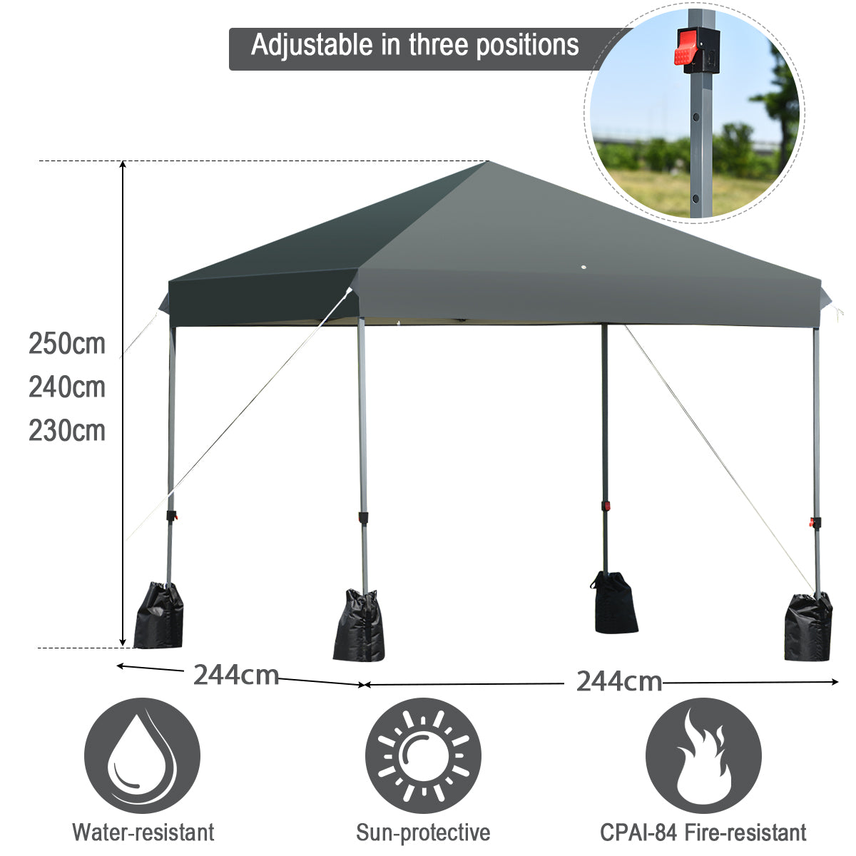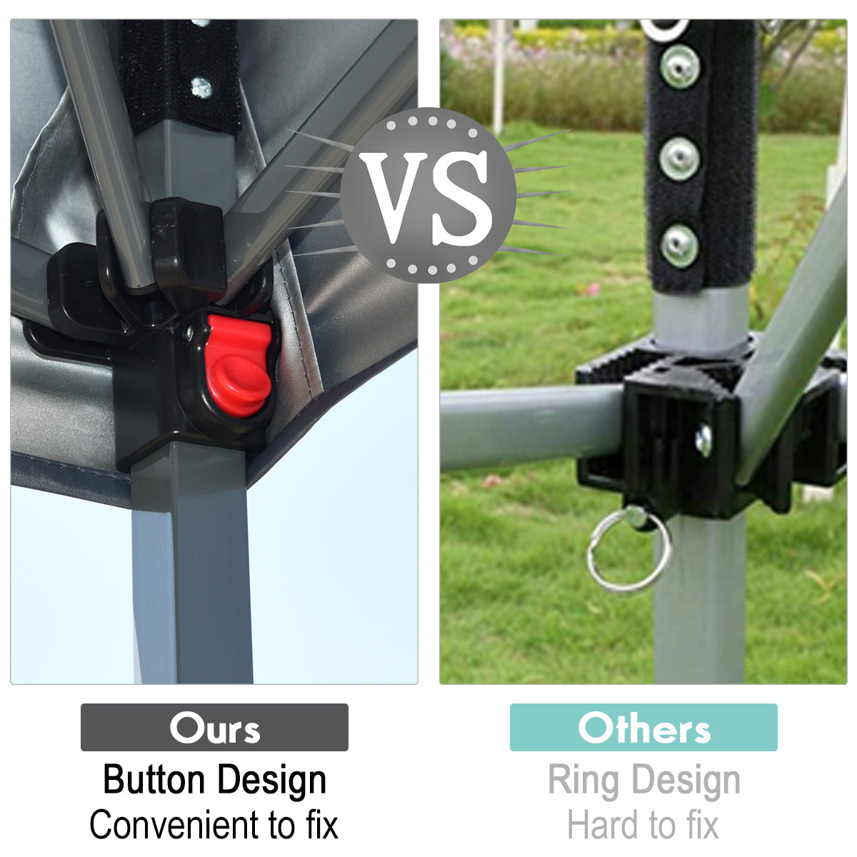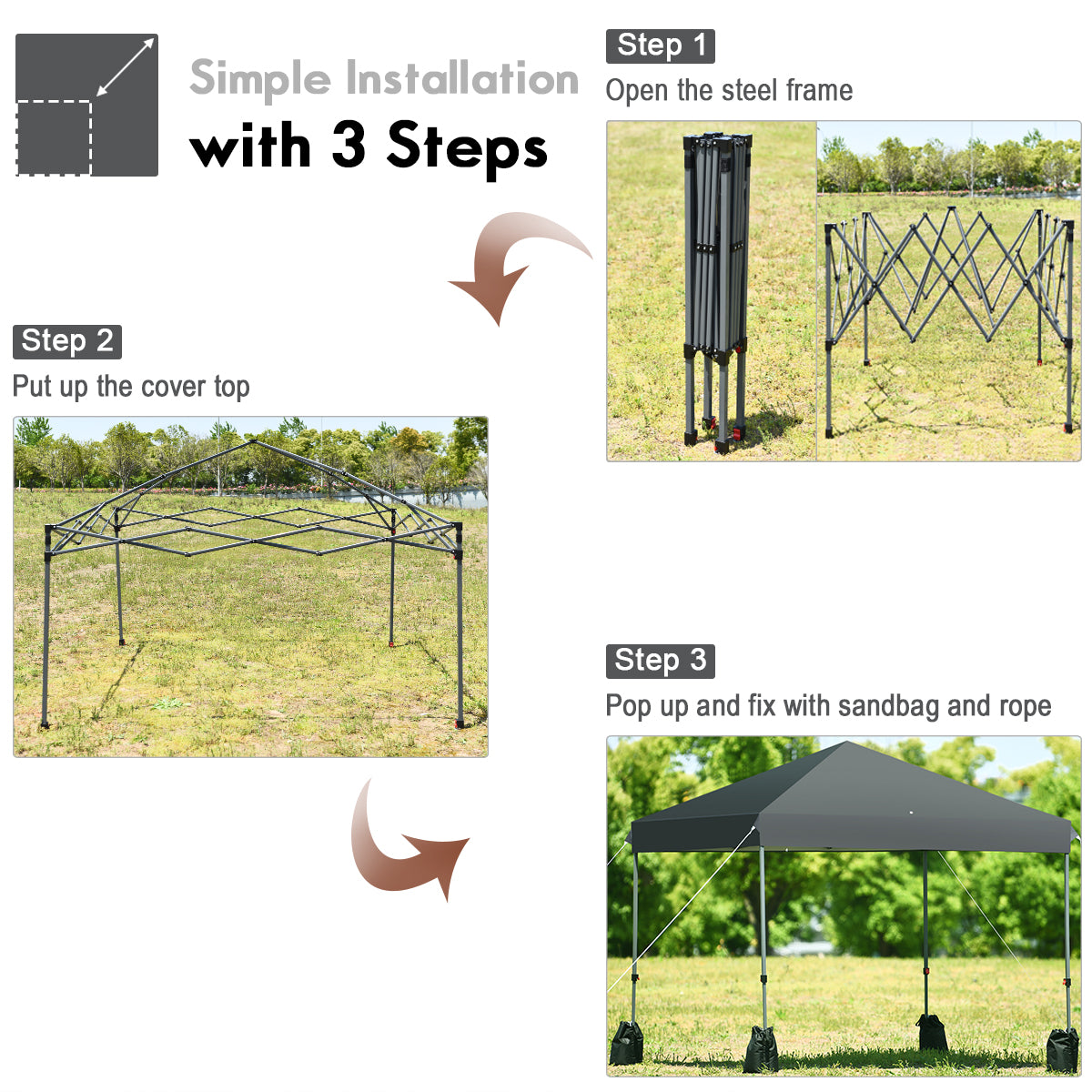 Sturdy Frame with Adjustable Height: The frame of this folding canopy is made of premium steel, which is sturdy and durable. Comes with stakes, wind ropes and large capacity sandbags, the frame of the tent will be stable in breezy days. And the height of canopy can be adjusted with three positions.