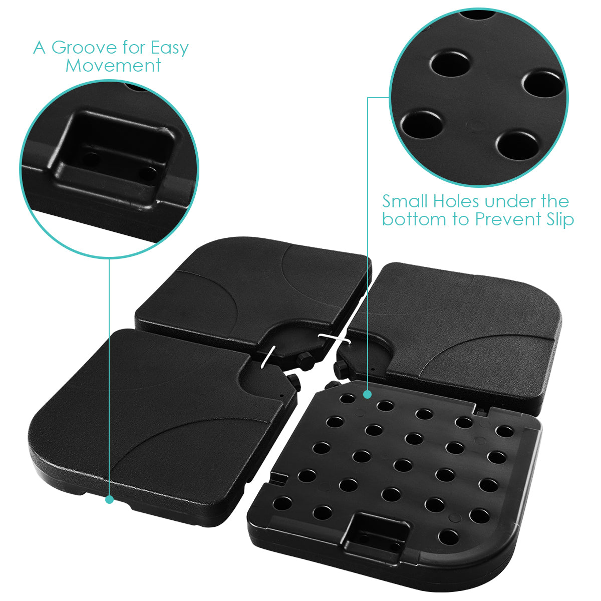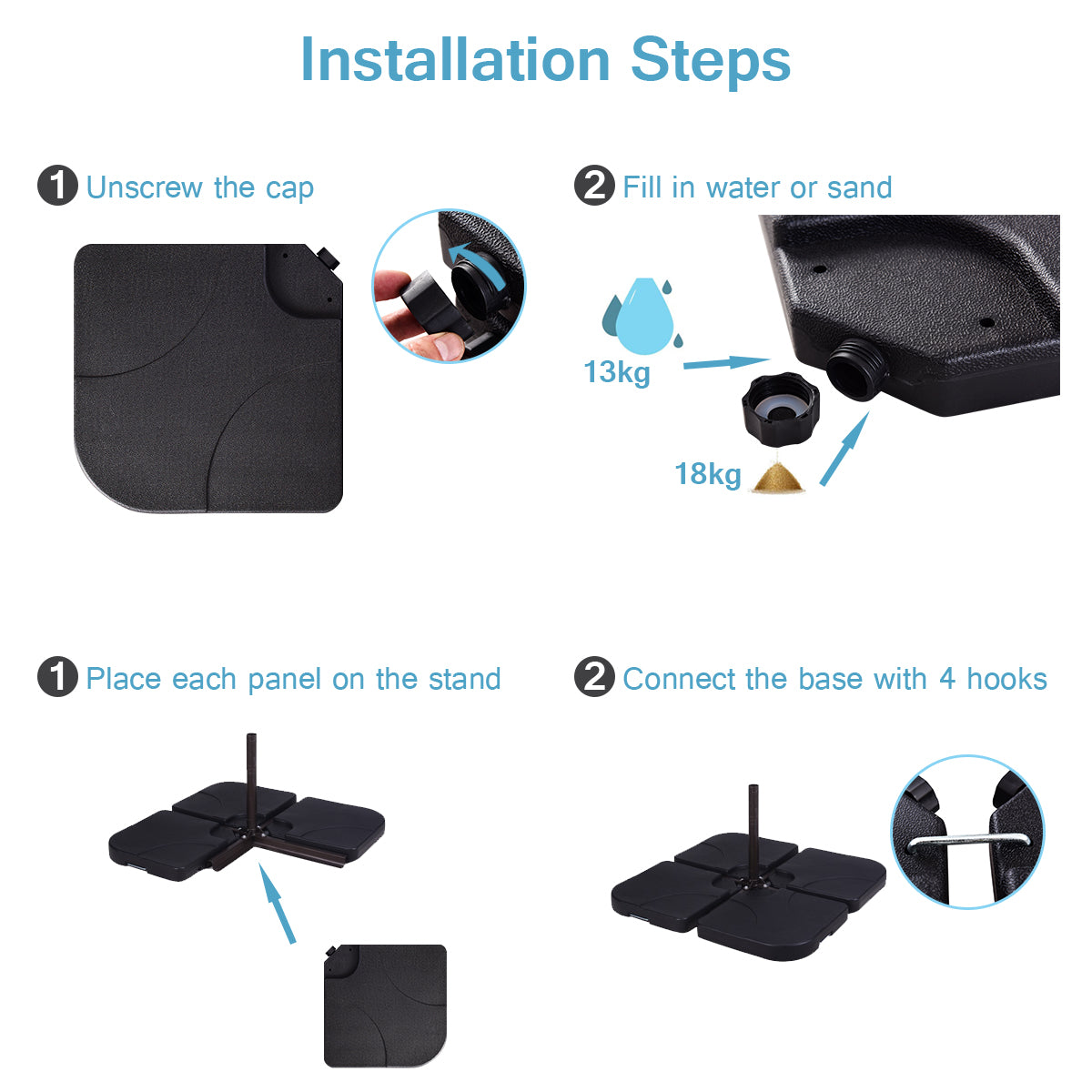 This brand-new water-filled umbrella base is a durable base for your patio umbrella. It's constructed of heavy-duty HDPE plastic with weather-resistant UV protection that prevents colour from fading and is easy to maintain. It can be filled with 72kg sand /52kg water so that plates provide additional weight to make your patio umbrella stand perfectly in windy conditions, You don't need to worry about any puff of wind which disturbs your summer relaxation in the shade. Don't hesitate to buy one!