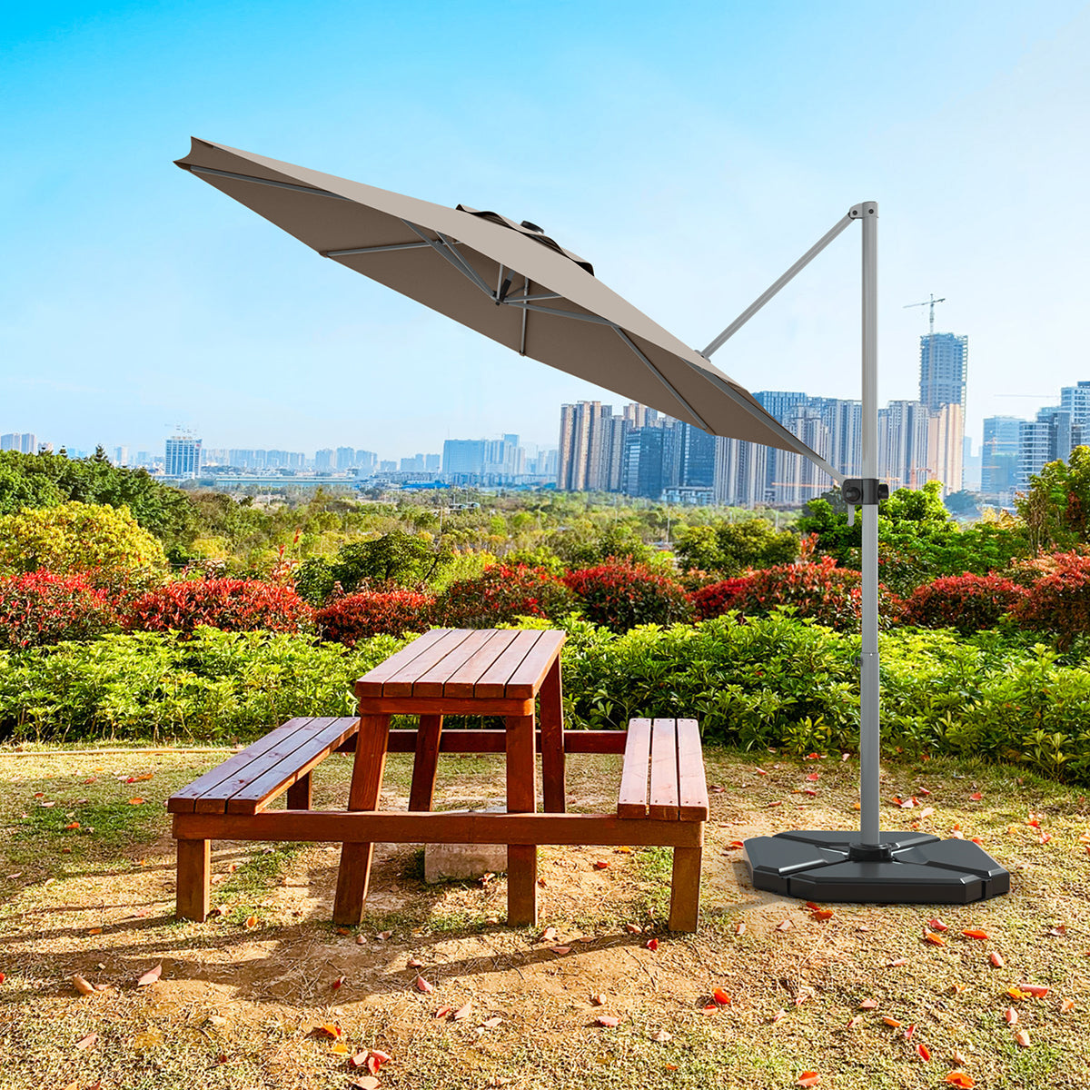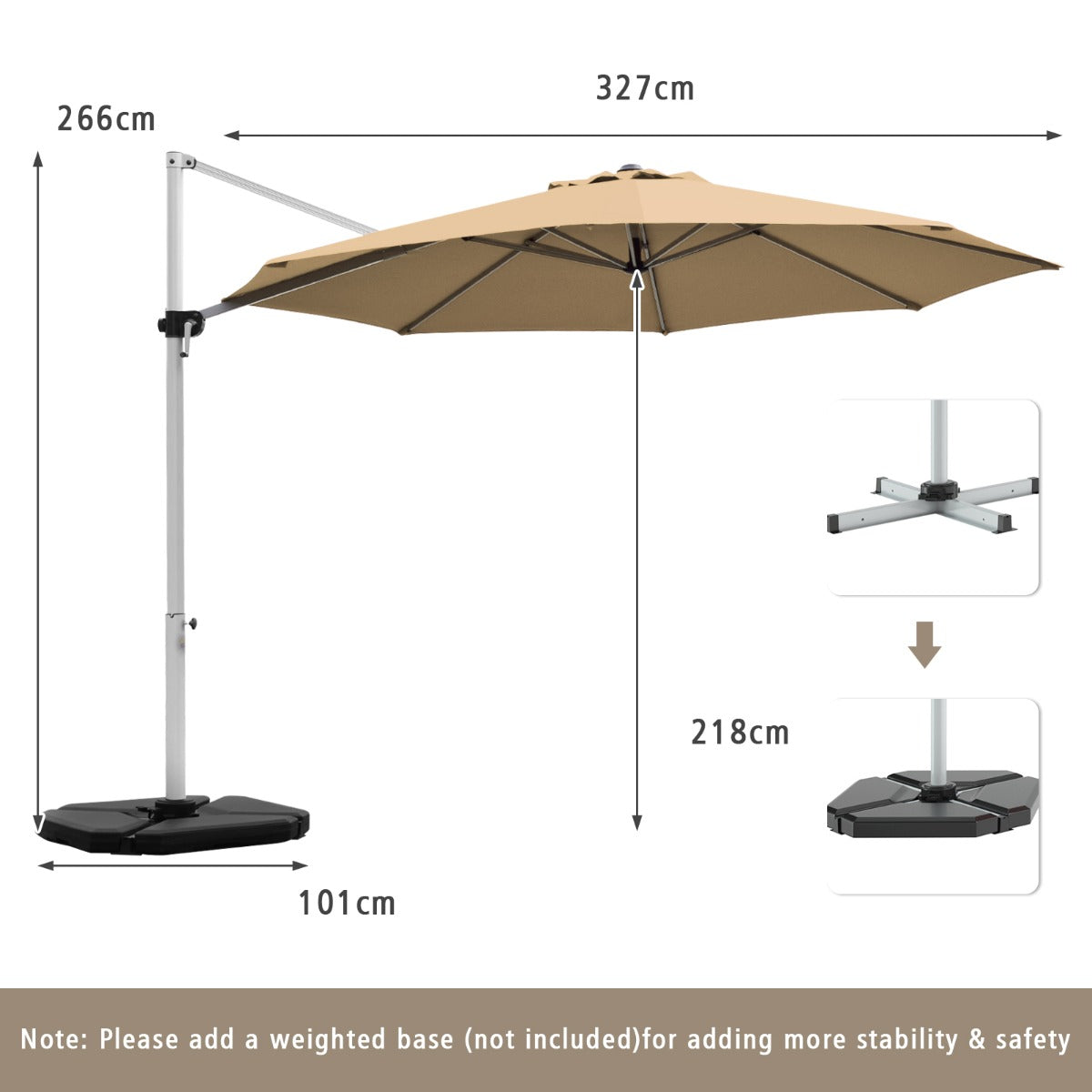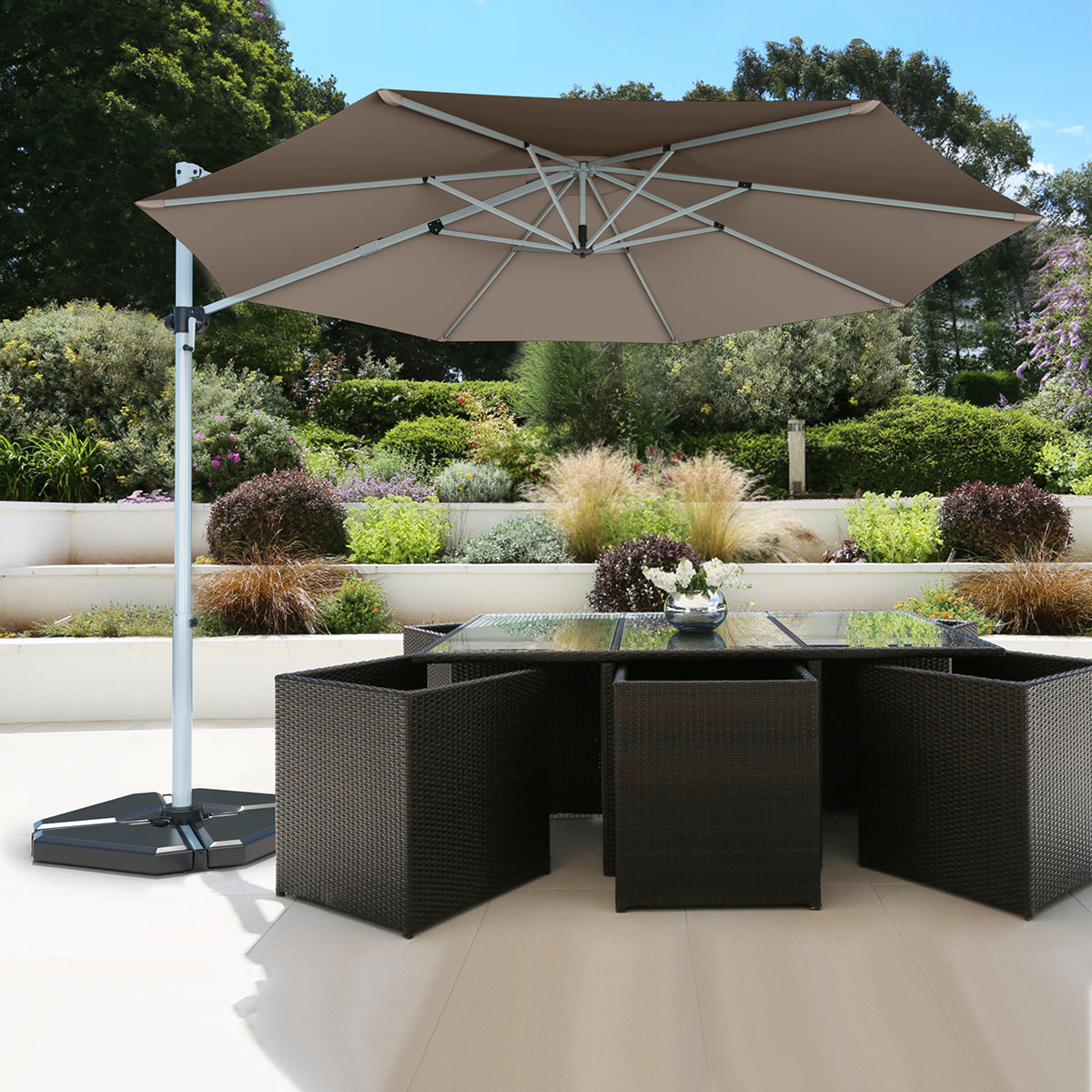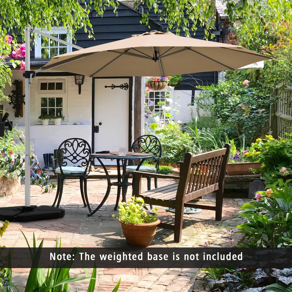 All-Direction Shade Enjoy: With the 335 cm diameter offset canopy, this deluxe patio umbrella will provide a spacious area of shade that can be used over tables and swimming pools to protect you from summer sun, sudden rain, harmful rays and dazzling light. Besides, the umbrella can be rotated 360 degrees to provide you with more sunshade solutions.