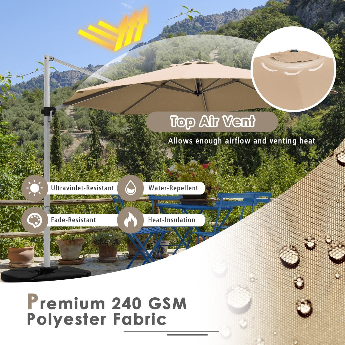 Enjoy your outdoor leisure time with this deluxe patio hanging umbrella! Our umbrella is a perfect choice for your outdoor living space such as your garden, porch, poolside and more. It can be easily operated through the crank and tilt system. The angle and height of the canopy is adjustable to block the sunlight in different directions. With a spacious canopy of 335 cm diameter, this umbrella provides an extra large shade area to keep you cool on hot days. Besides, made of tough aluminum pole, 8 iron ribs and 240gsm polyester fabric, this offset umbrella is sturdy and durable for long-lasting use. And the cross base will make it more sturdy. At the top of the canopy, there are several vents ensuring enough air flow. In addition, when not in use, there is a fixing rope for easy storage.