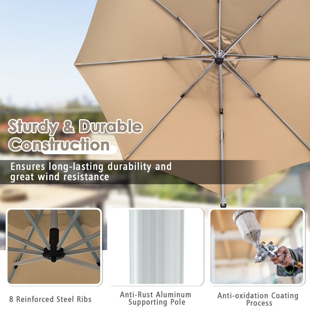 Sturdy & Durable Construction: Made of thickened powder coated aluminum pole plus 8 heavy duty iron ribs, this patio offset umbrella has strong wind resistance and provides great support for wind and rainy conditions. Moreover, the cross base is designed to increase stability and robustness.