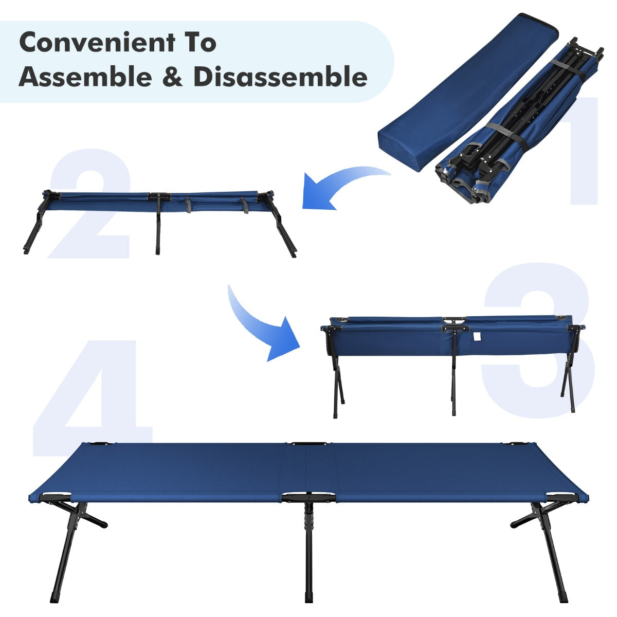 Stable Construction with Strong Load Capacity: Constructed by solid steel frame and tear resistant PE coated oxford fabric, this camping cot is sturdy enough to hold up to 160 kg. Also, X-shaped support and the non-slip feet design makes the whole construction more stable and safer.