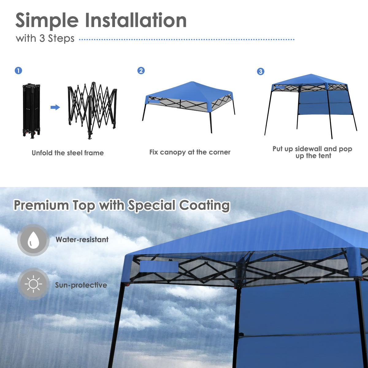Sturdy & Stable Frame: The frame of this folding canopy is made of premium steel, which is sturdy and can be used for long term. And the height of canopy can be adjusted in two positions. With slightly slant legs and stakes, the tent will be stable in breezy days.