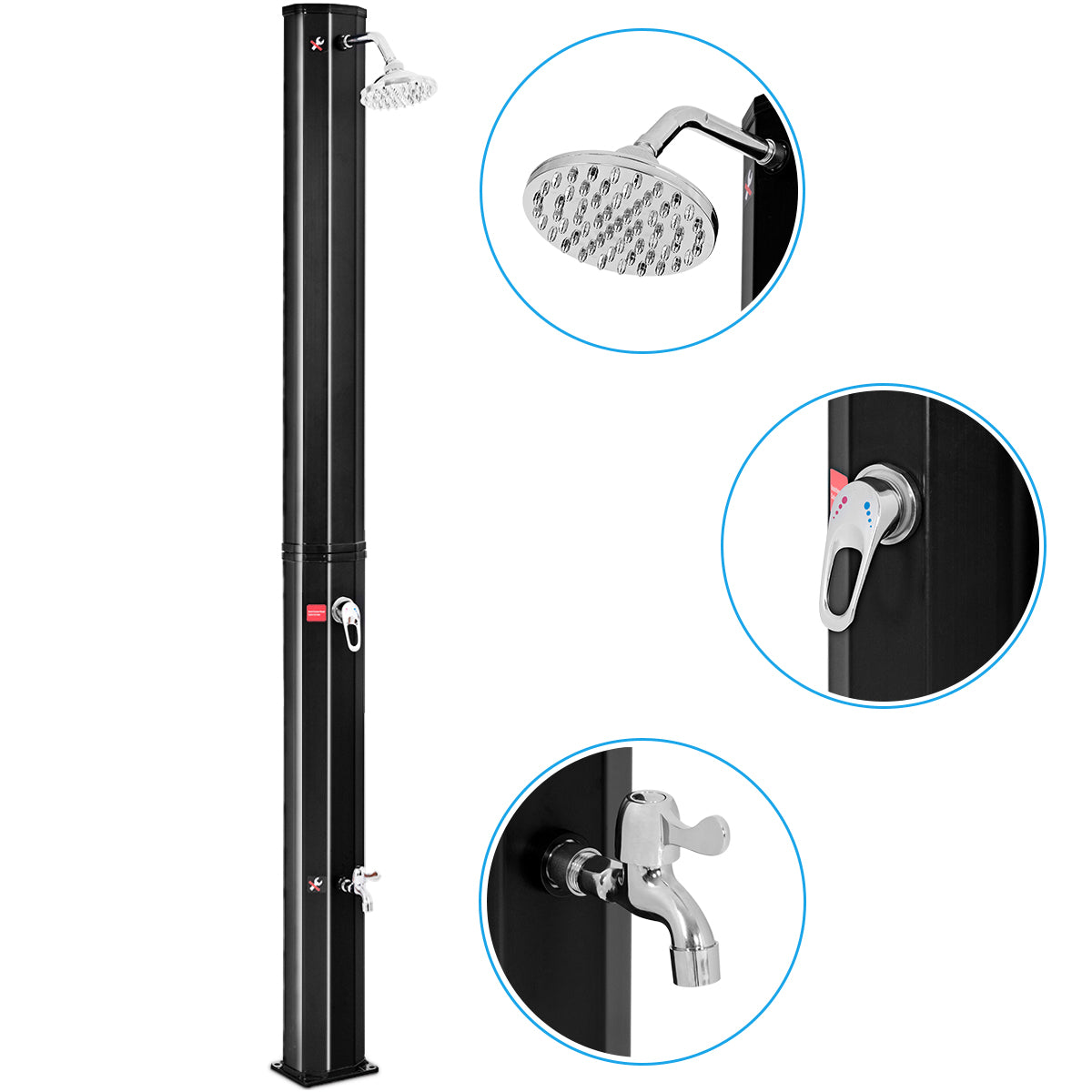 ãSolar Heated Design: Heating water with solar energy when rinsing off before and after swimming with an outside shower that uses water warmed by the sun's energy. With a neat and modern appearance, this solar shower will be a great addition to your garden or your swimming pool.