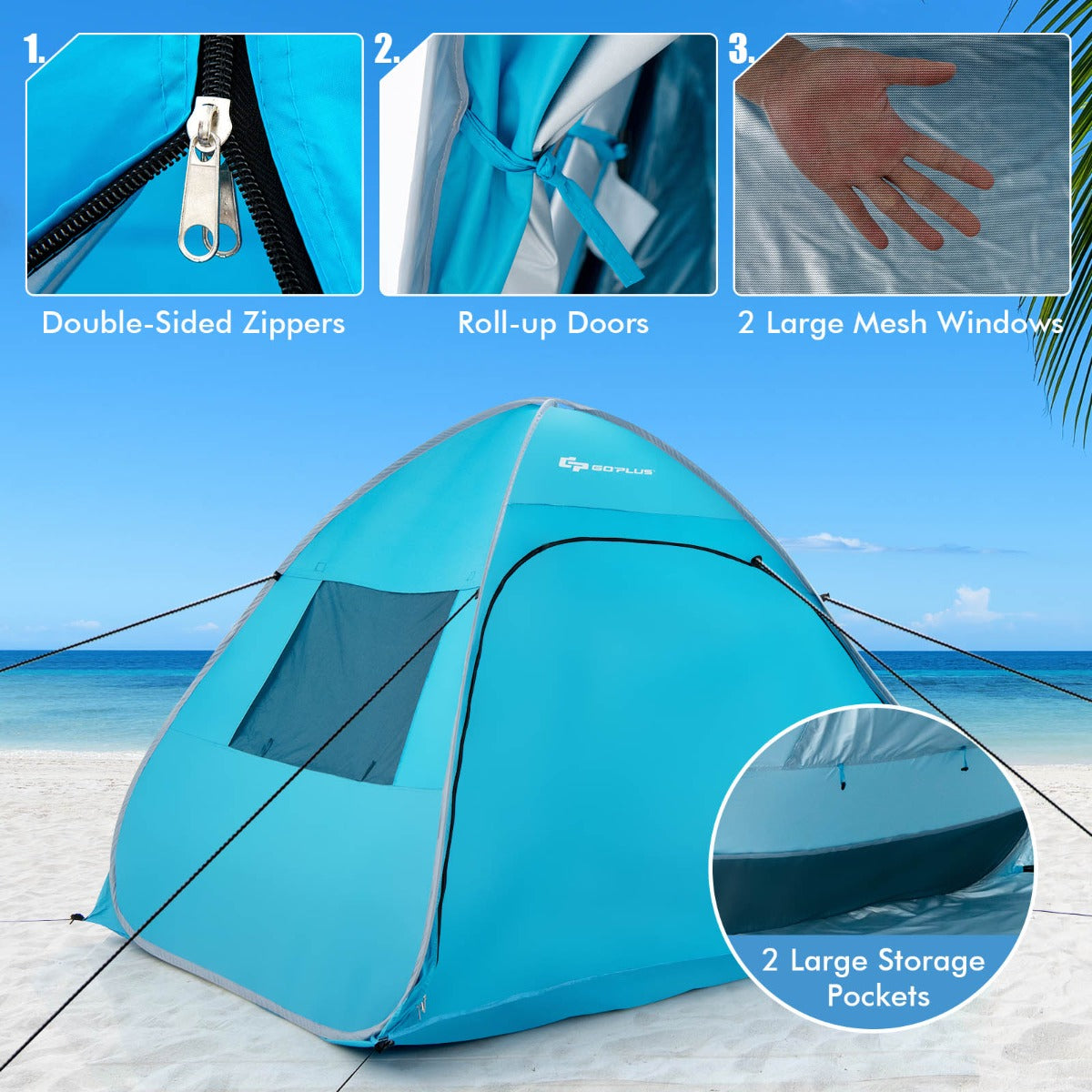 Roomy Space: The large pop-up beach tent measures 200 x 142 x 146 cm (L x W x H) that can accommodate 2-4 persons, which is perfect for enjoying vacations with your family. Moreover, you can also use the front door as a mat offering extra space for more activities. And it can also be zipped up, so the tent would be a private beach cabana.