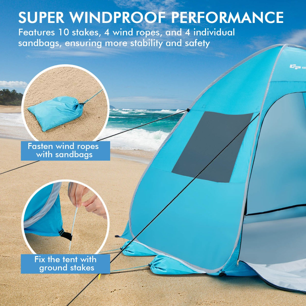 Super Windproof Performance: Equipped with 10 metal stakes and 4 wind ropes, the sun shelter can be firmly secured into the soil or sand to add more stability. More than that, there exist 4 individual sandbags for adding sand or weights, ensuring great windproof performance.