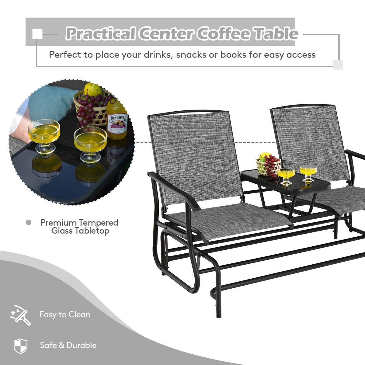 Easy to Assemble and Clean: This rocking chair comes with all hardware and necessary tools. Follow the instructions and you can assemble it quickly and easily. And the smooth frame and tempered glass tabletop are easy to clean just with a simple wipe.