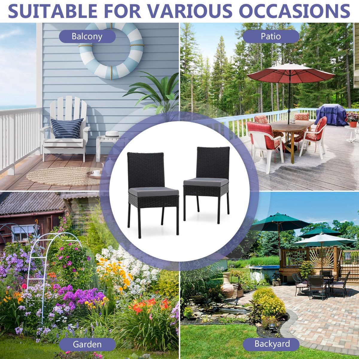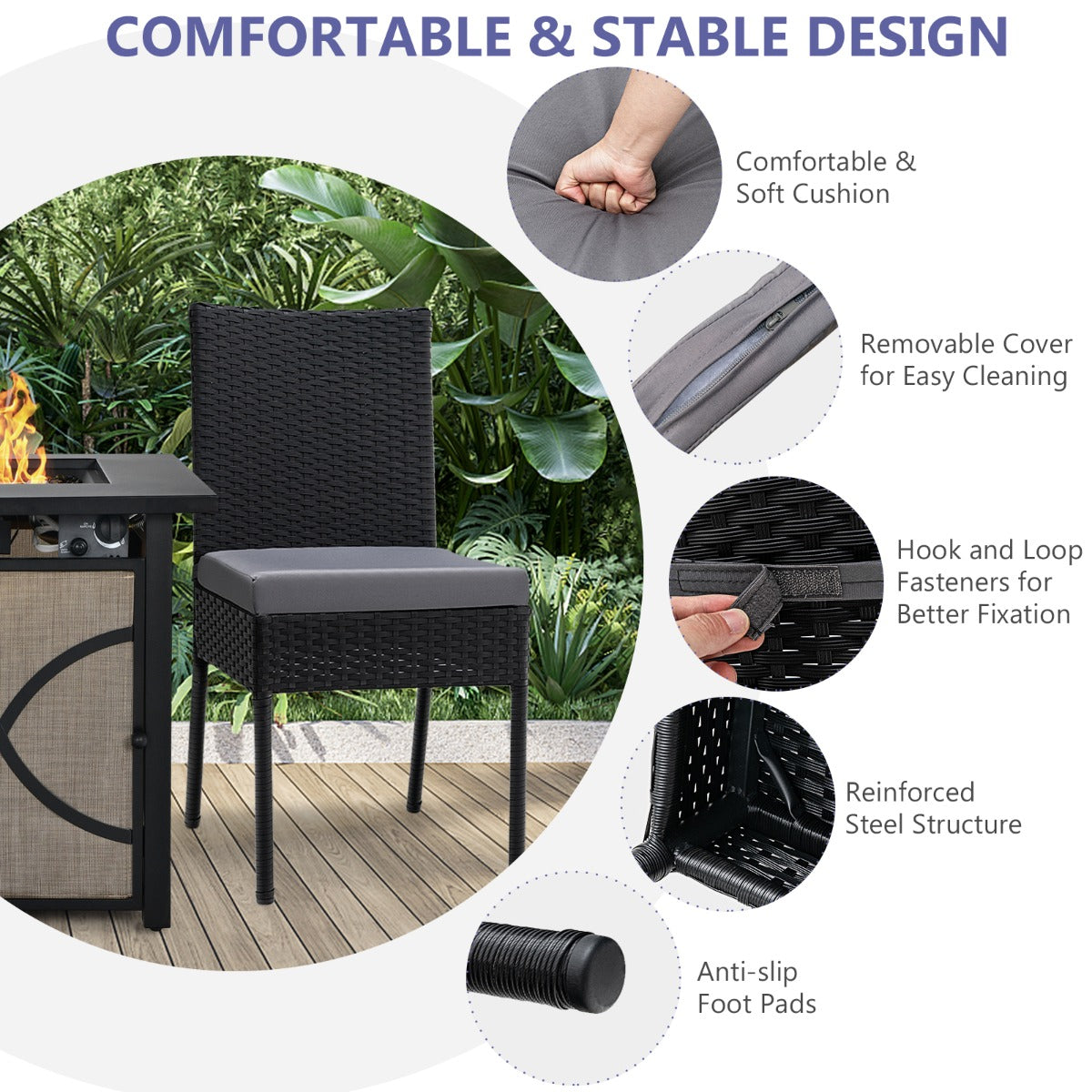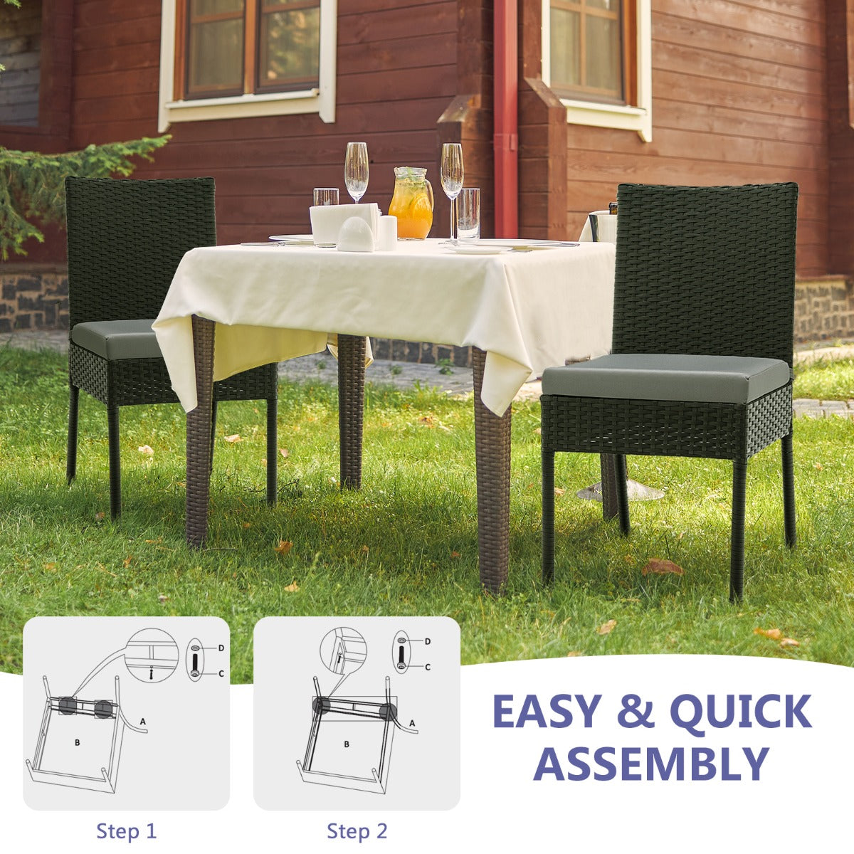 Made of all-weather PE wicker and rustproof steel frame, these patio chairs will show you their strong stability and high durability in outdoor conditions. When you sit on the chair, the soft padded cushions bring a comfortable sitting experience. And the fixed ropes with hook and loop fasteners keep cushions in place. In addition, to providing coziness, these patio dining chairs match your dining table (not included) perfectly because of the suitable heights.