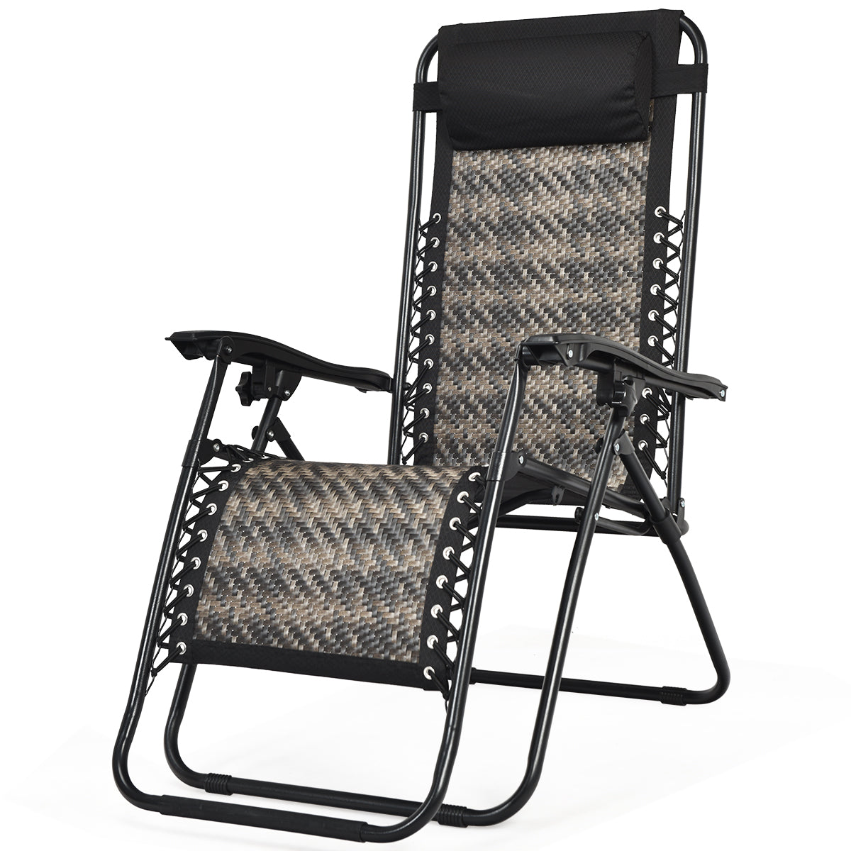 Coming with wonderful craftsmanship, this chair can emulate the weightlessness experienced in space and provide you with maximum comfort with a premium rattan seat. Made of a solid steel frame, the chair is stable enough to ensure a long service time. And the durable rattan seat is tightly connected with the frame by bungee rope for added safety. Widened armrest and the removable head pillow can well support your body. And this patio lounge chair is lightweight and foldable, which is easy for storage and transportation.