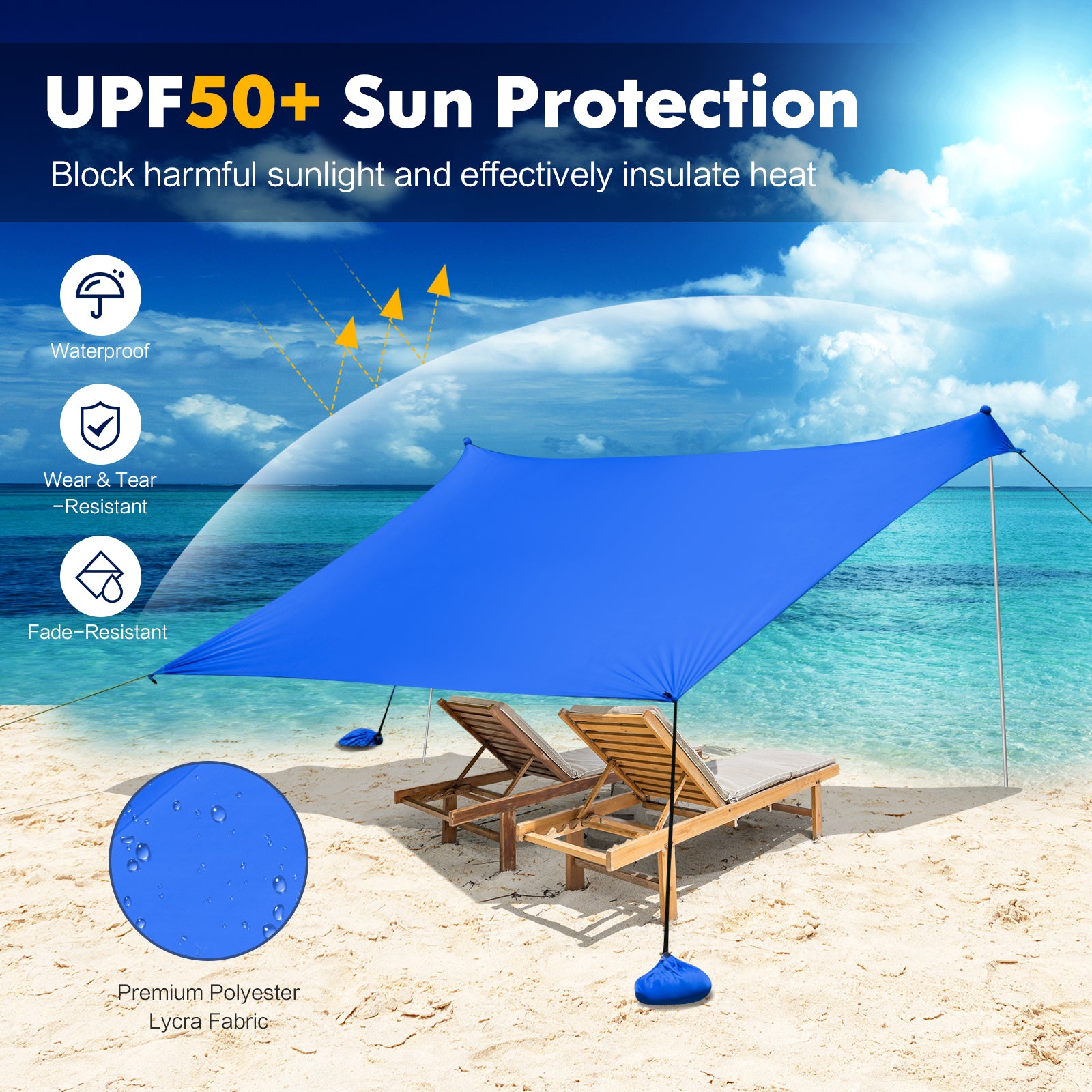 Enjoy the great outdoors while remaining almost totally protected from the sun's harmful rays with our high-quality Lycra shelter. This shelter is easily set up and can be angled out to provide a large covered area for relaxation during camping, fishing or beach volleyball break. This tall beach canopy is extremely light, durable, tear-resistant and even water-repellent for long-term use. Moreover, with metal edges, bonus sandbags and additional 4 peg stakes, the sunshade will stand firmly on the beach and other possible terrains according to your personal needs. Thousands of families are using this beach sun shelter to keep their kids safe, happy and out of the sun! It comes packed in a waterproof carry bag with a zipper and weighs only 3.2 kg/4.1 kg so you can sling it over your shoulder and take it anywhere!