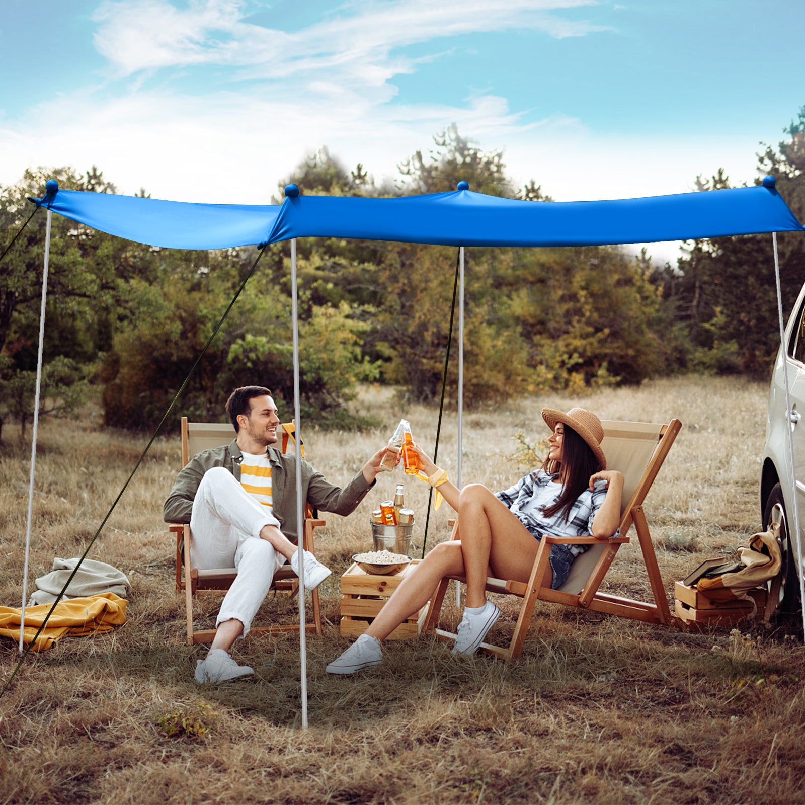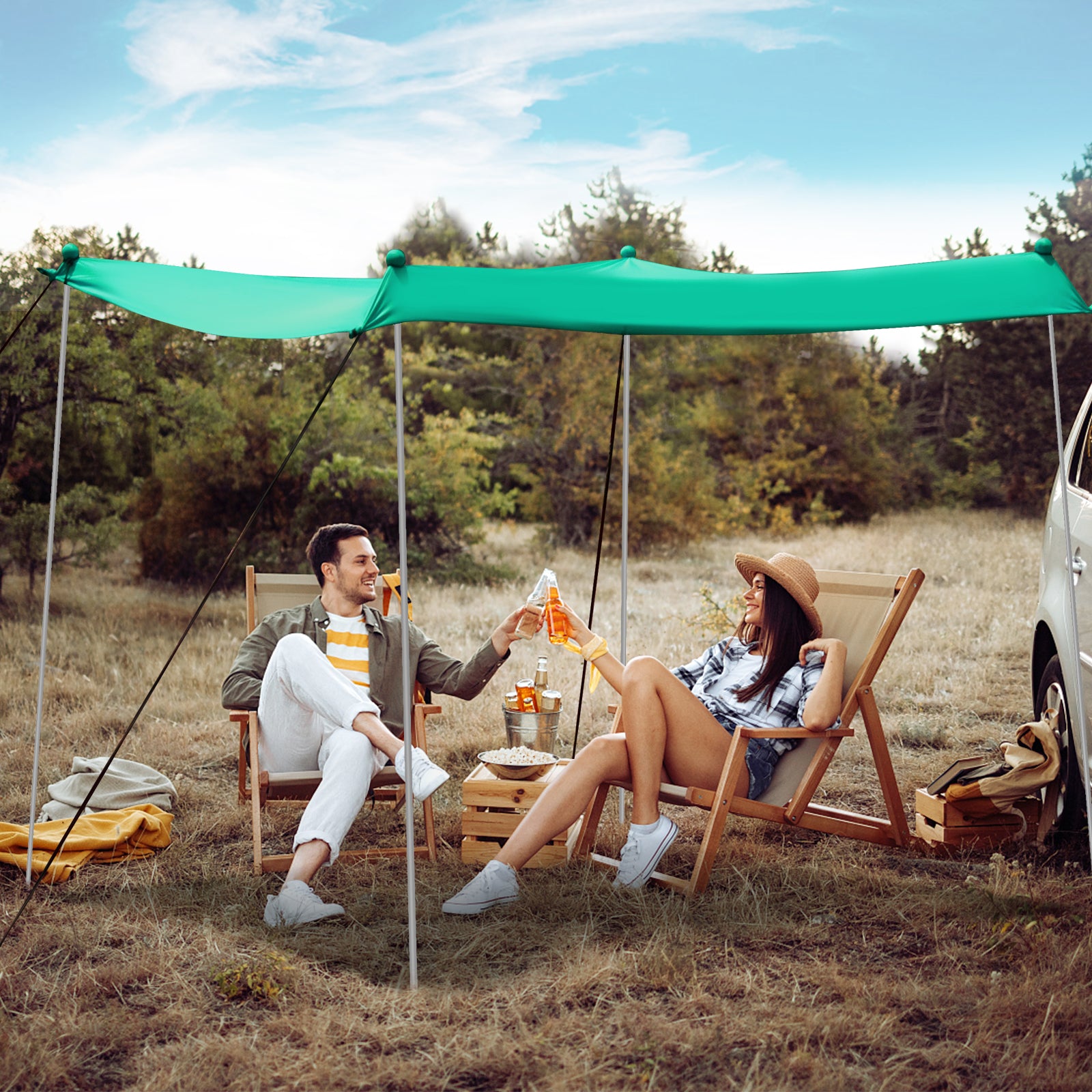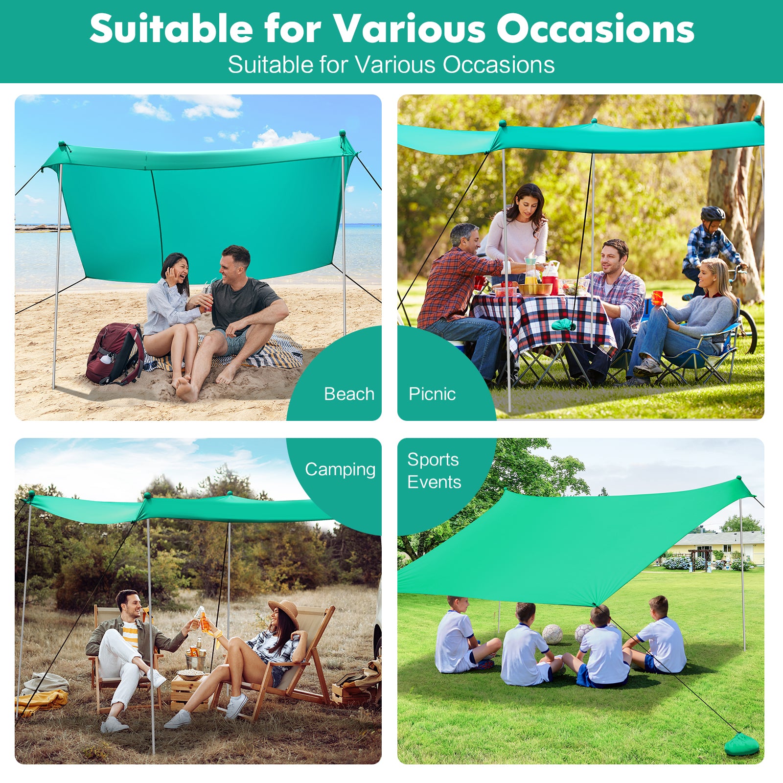 Easy Setup: The beach sunshade is easy to set up, and all you need to do is unfold the poles, then fix the canopy with the elastic cords, and then fill it with sand. More than that, you can use all 4 poles to make a taller canopy and creates a bigger usable shade area, or use just 2 poles you can customize a private relaxing sunshade zone with wanted angles.