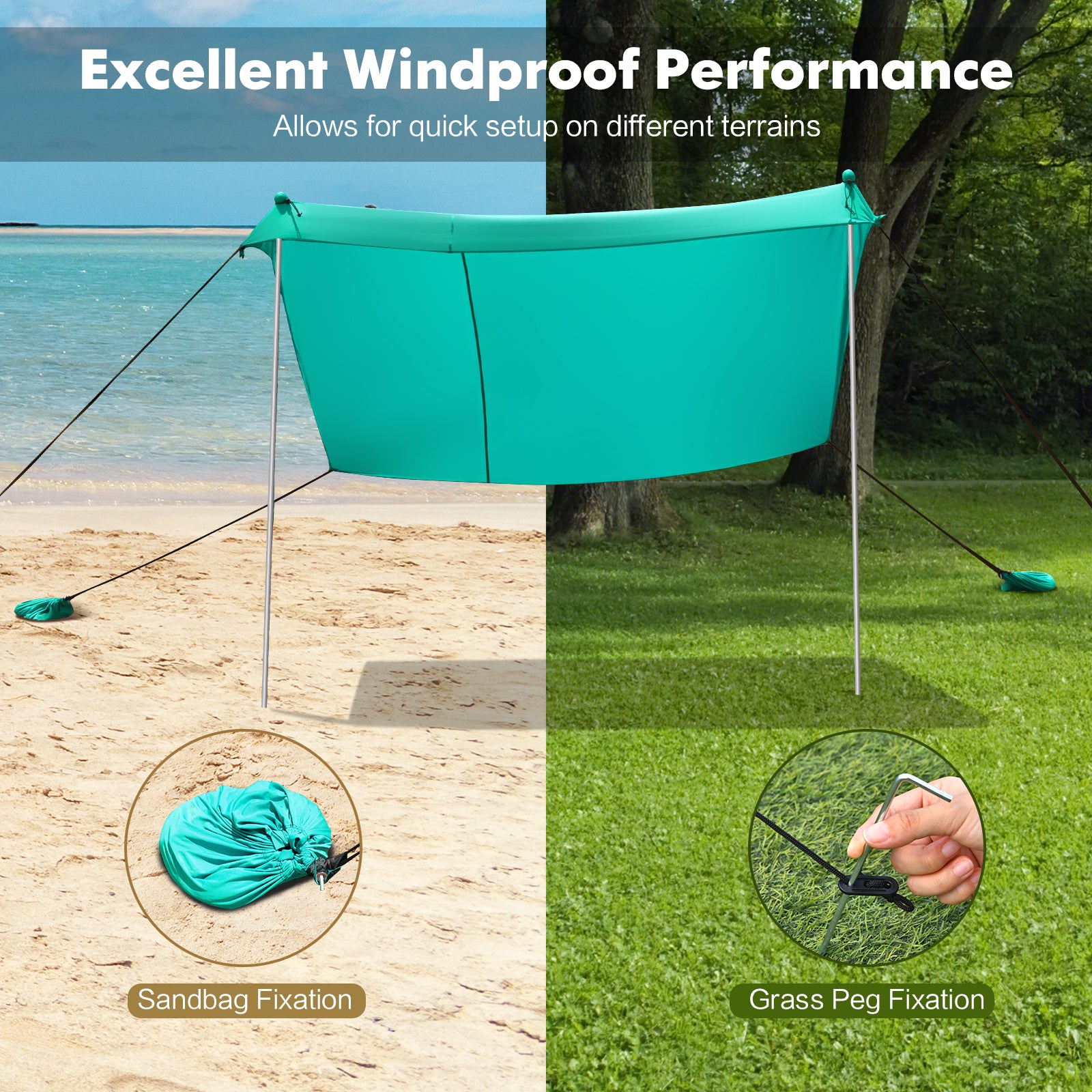 Excellent Windproof Performance: The beach sun shelter is equipped with 4 sandbags and a sand shovel for quickly holding a large amount of sand, enhancing wind resistance. And there exist 4 peg stakes for fixing the canopy on the grass. In addition, the aluminium pole with a pointed stake is easy to anchor into the sand or ground.