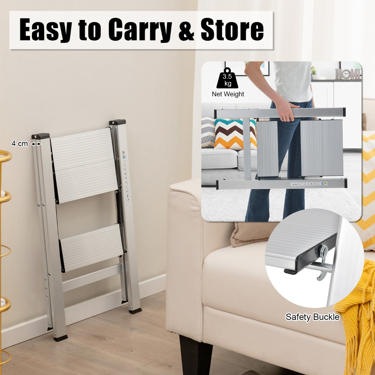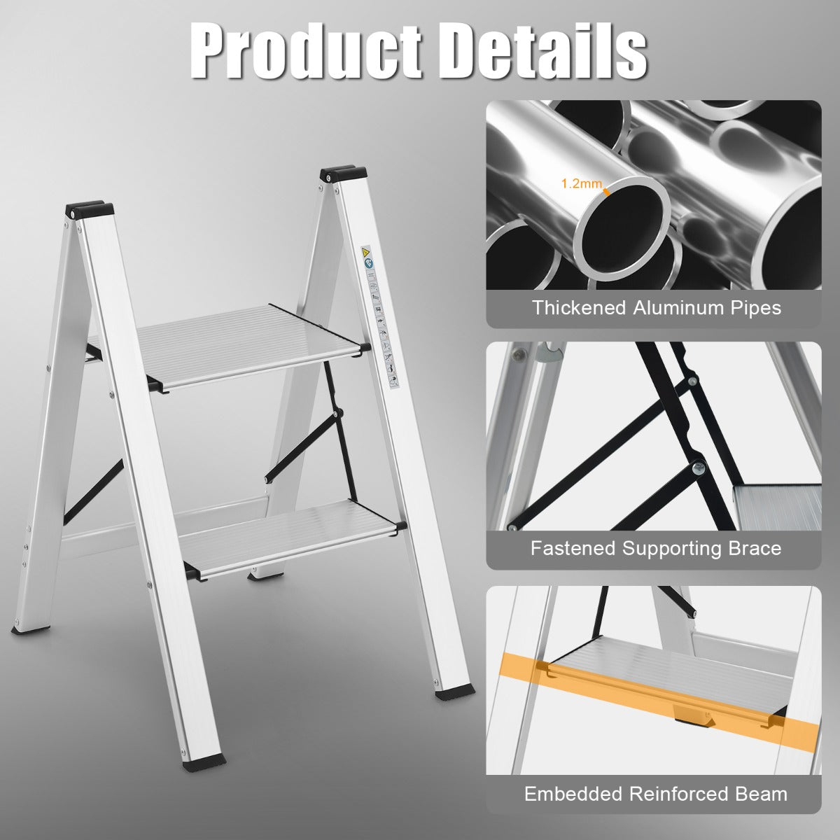 Sturdy Aluminum Frame: The step ladder is constructed of 1.2mm thickened aluminium pipes, which are sturdy, rustproof and lightweight. Moreover, the fastened supporting brace, safety buckle and embedded reinforced beam ensure higher stability.