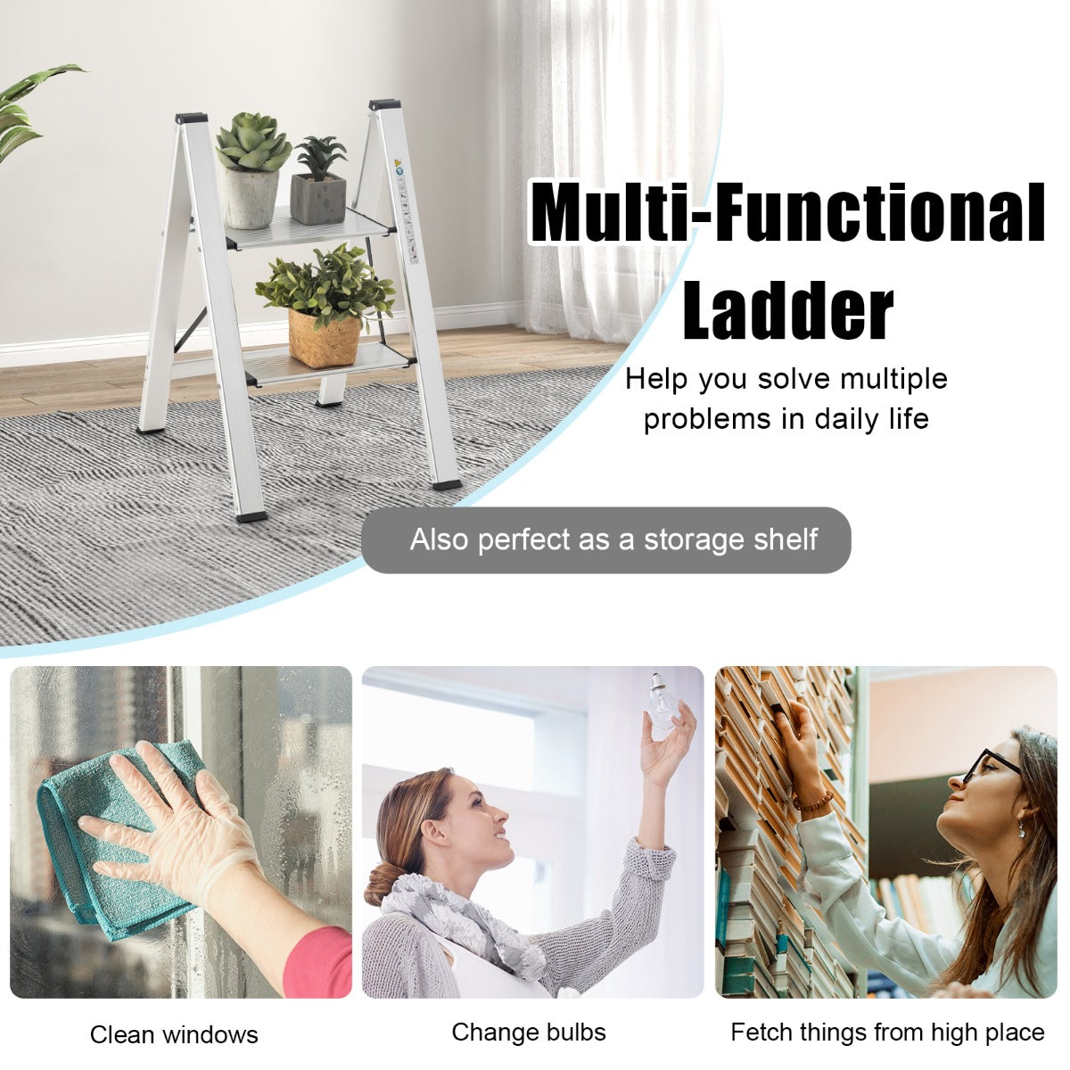 Multifunctional Ladder: With this 2-step folding ladder, you can reach higher with less effort. Whether you want to clean windows, change bulbs or fetch things from a high place, the step ladder will always help you a lot. Plus, it's also perfect as a storage shelf.