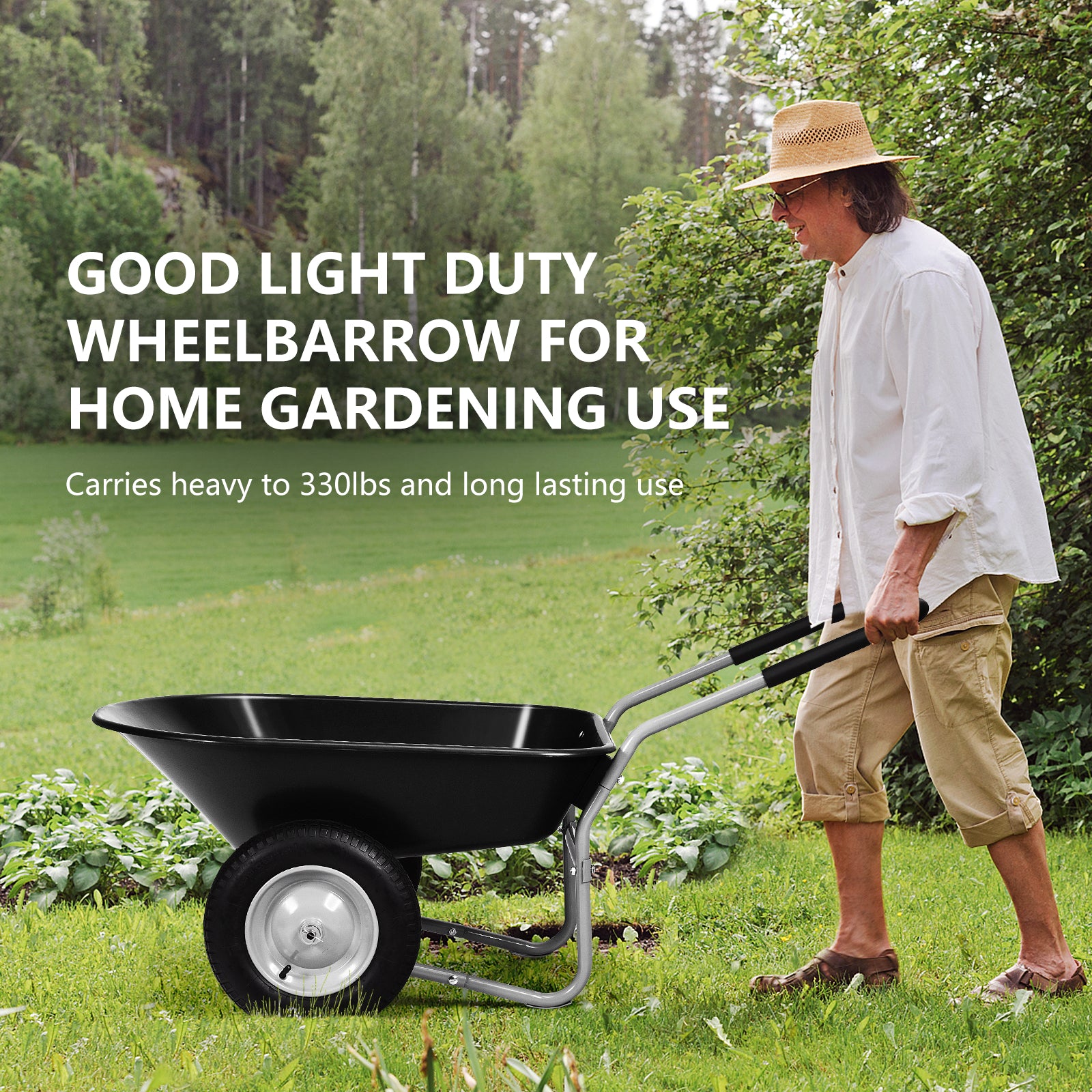 Rigid Steel Frame: Constructed of a stable and durable heavy-duty frame and PP container, this garden wheelbarrow offers you a tough yet lightweight cart to transport your fertilizers and weeding in your gardens. And the rubber pneumatic tires on both sides make lifting, balancing, and maneuvering easier.