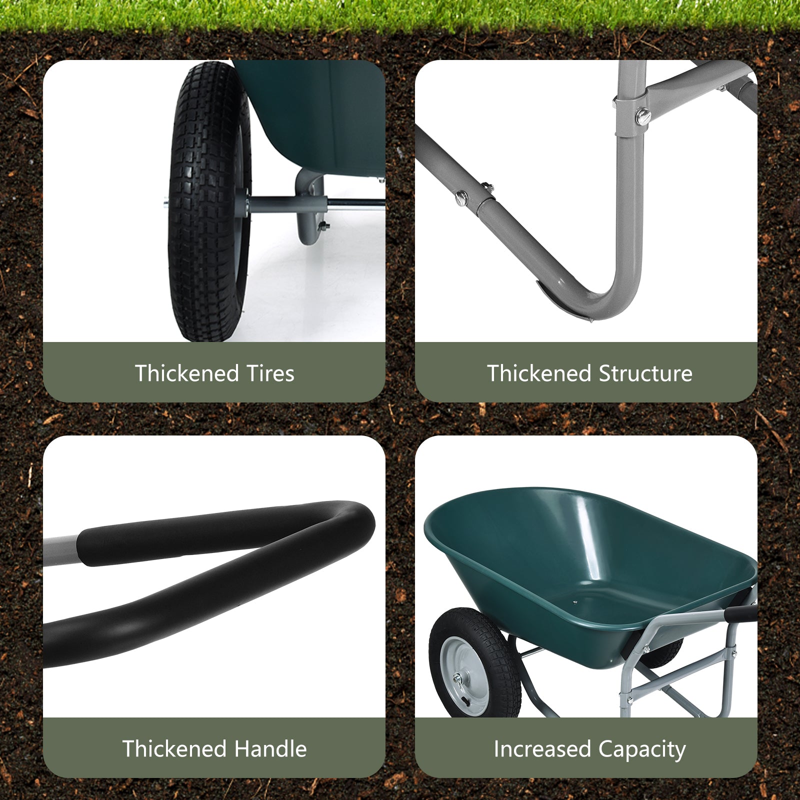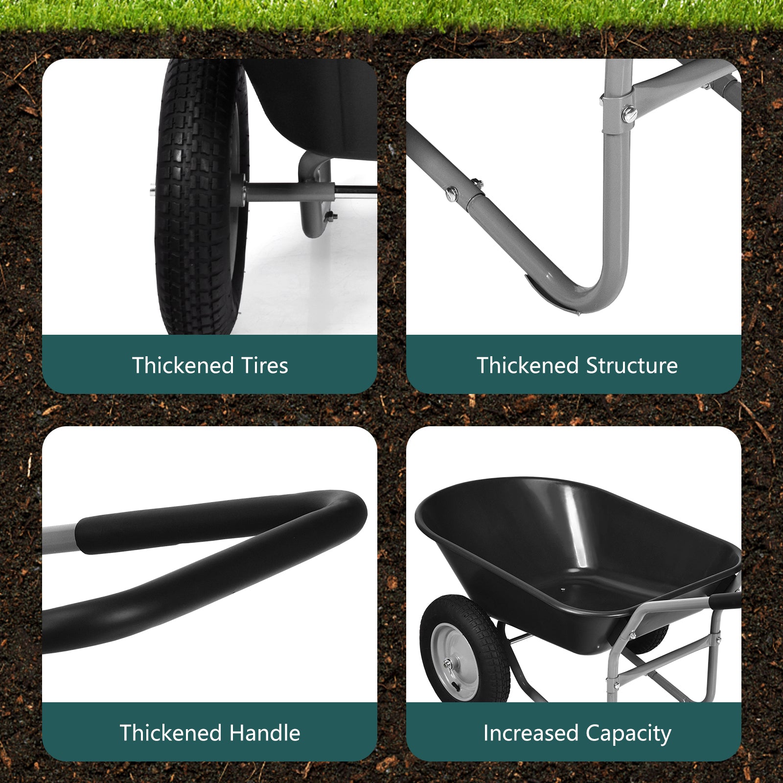 Super Large Capacity: Featuring a deep volume with an easy-to-dump design, this yard cart provides 5 cubic feet of space for the 150 kg hauling capacity. And the large pressed area can be uniformly forced, ensuring that the container will not deform and break as time passes.