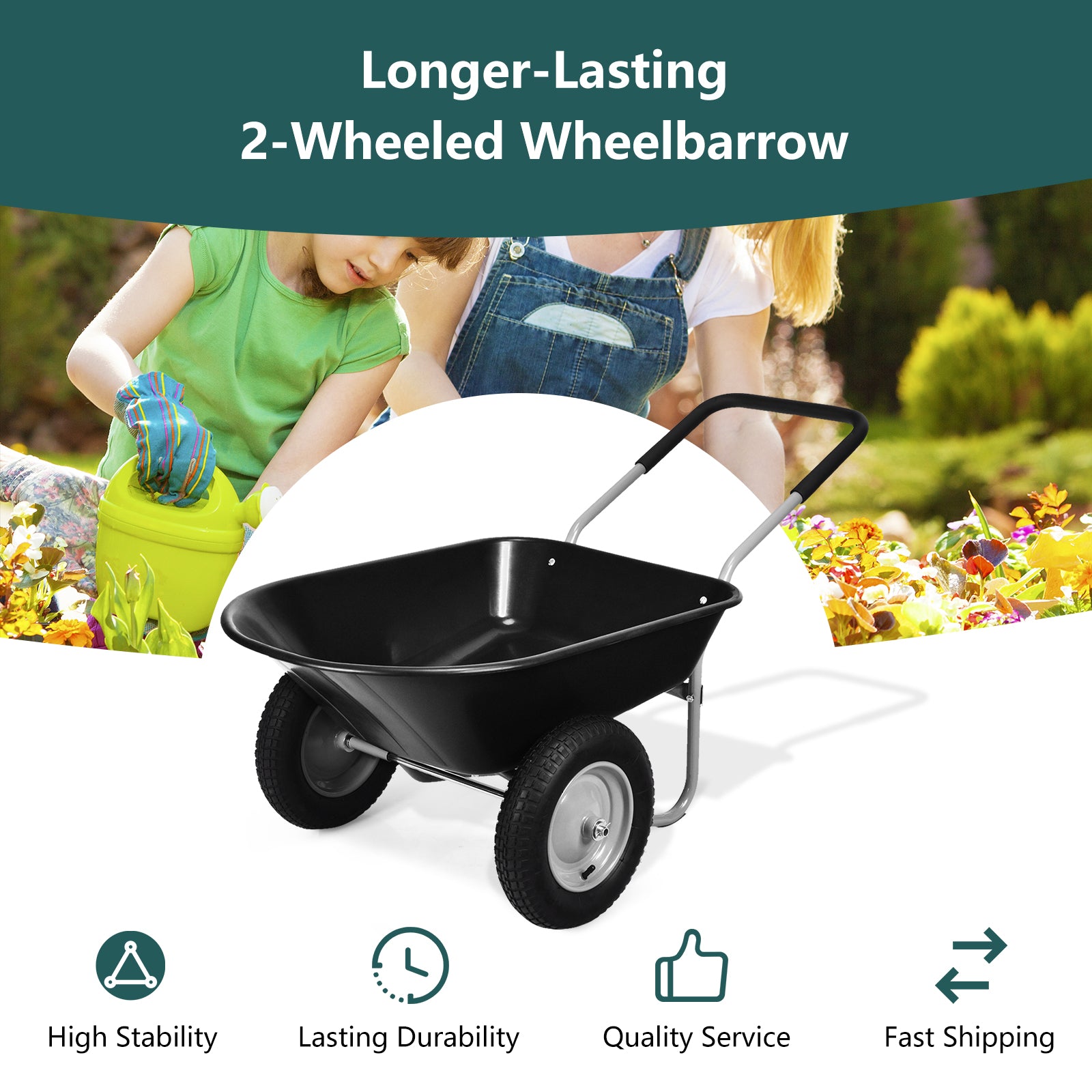 This garden barrow with dual wheels is perfect for your daily farm and garden work! The rigid steel frame and PP container with exquisite design make it easy to hold up to 150 kg hauling capacity and uniformly scatters the force to ensure a firm and lasting standing upright. The large and wide pulling handle with two pneumatic tires effectively keeps its balance and gives convenience to loading and dumping fertilizers and weeding for your garden work. If you're an infatuated gardener, this portable but heavy-duty wheelbarrow must be the best choice!