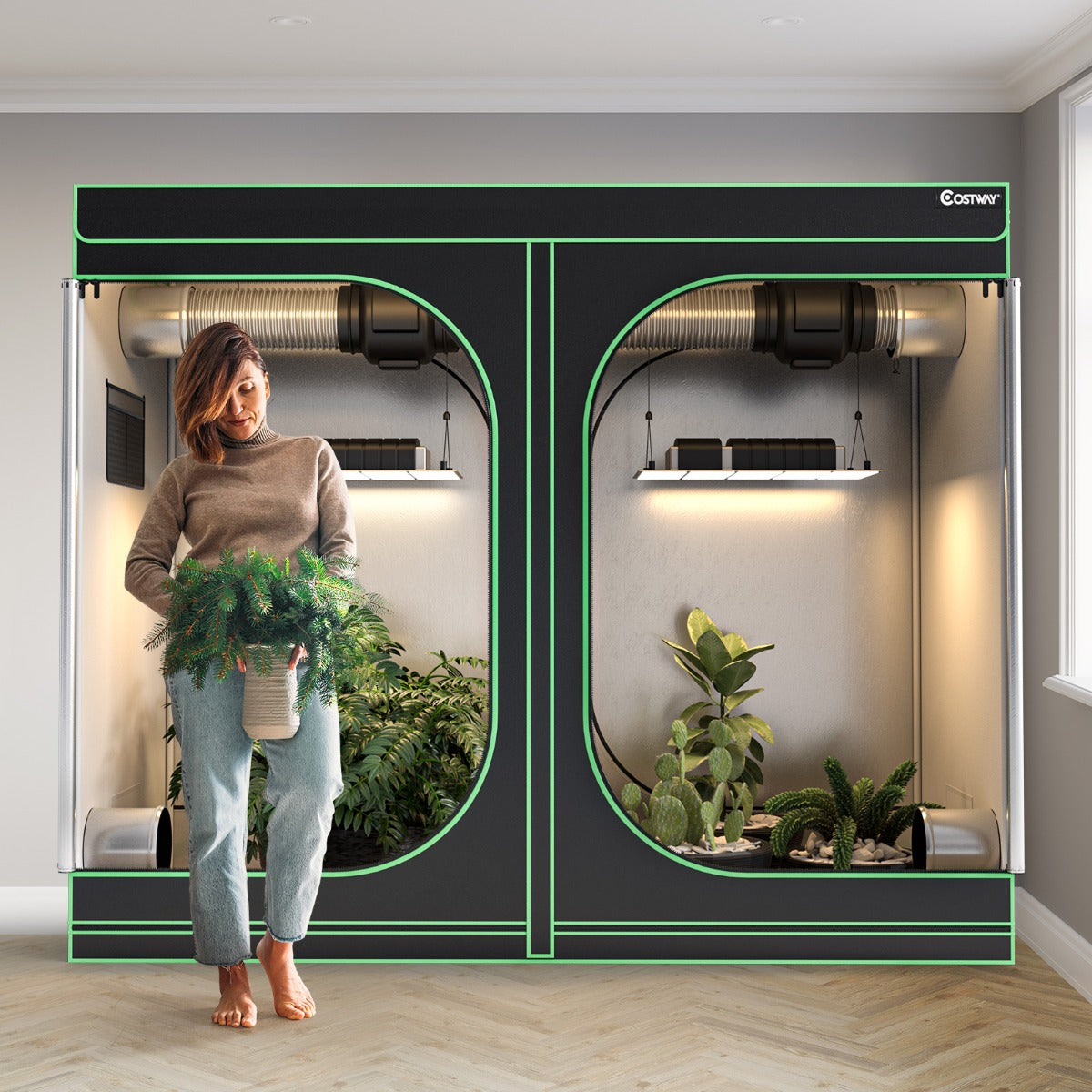 Viewing Window & Dual Ventilation: There is a big observation window help you conveniently observe the growth of indoor plants. And the window has translucent mesh, which effectively keeps insects out. Besides, many vents are designed to install carbon fan filter and promote the air circulation.