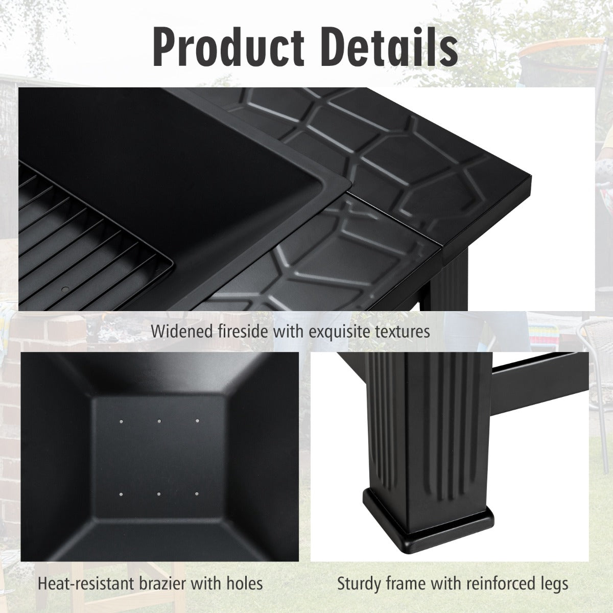 Large Capacity and Widened Fireside: The heat-resistant fire bowl can hold a large amount of charcoal, allowing your family and friends to enjoy party time.Plus, the widened fireside desktop around the central fire zone offers ample space for you to place drinks and roasting supplies.