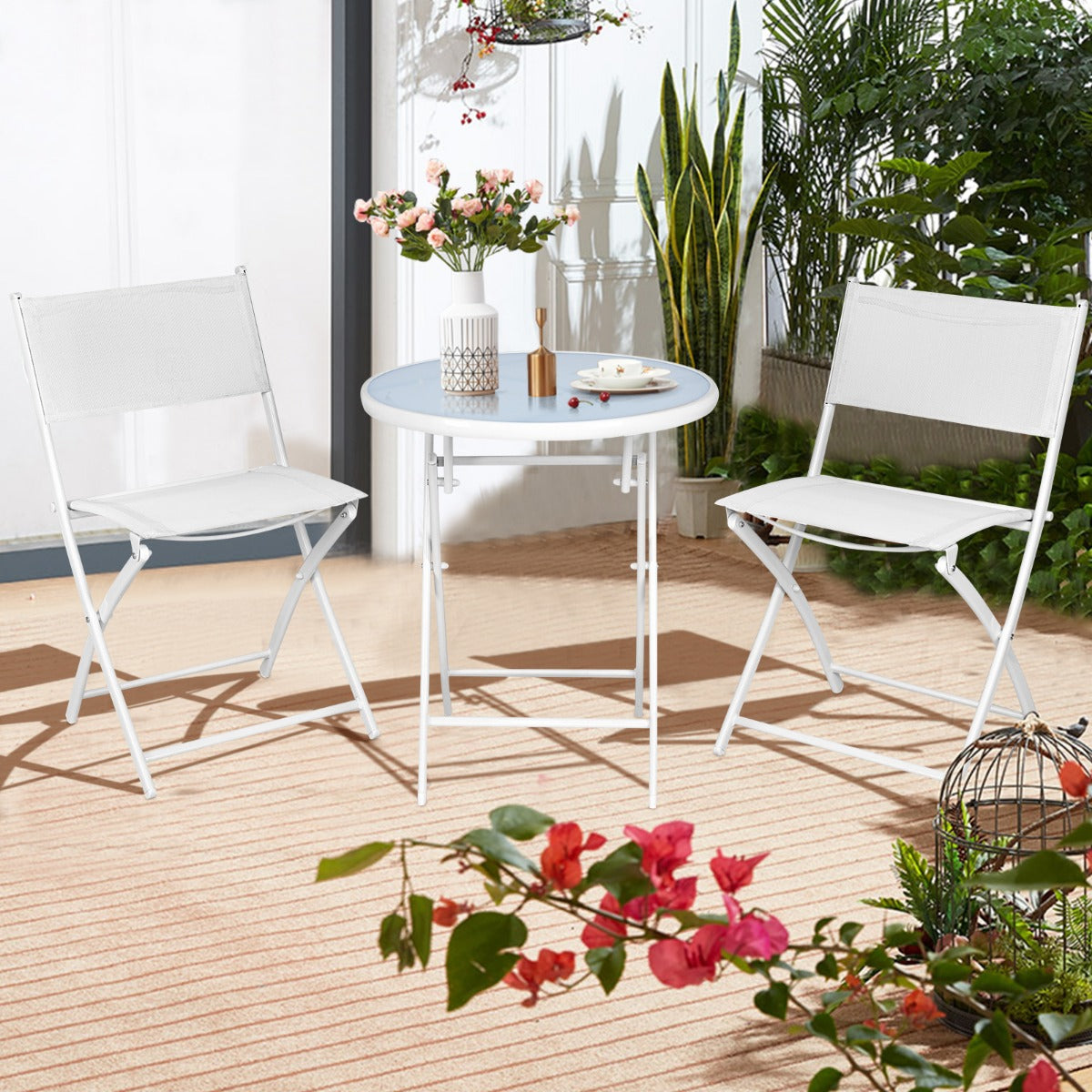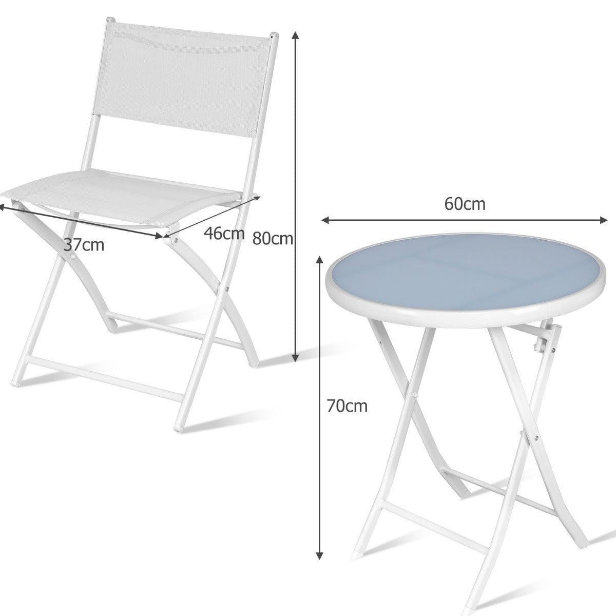 It includes two folding chairs and one folding coffee table with black tempered glass. The seat and the backrest are made of textile fiber. The frame of the chairs and table are made out of metal tubular and it is exceptionally sturdy .It enjoyable to have breakfast or afternoon tea in the garden or other outside space with this comfortable and attractive Patio Set which features a simple design. It will be your excellent choice to buy. Don't hesitate to buy it now!