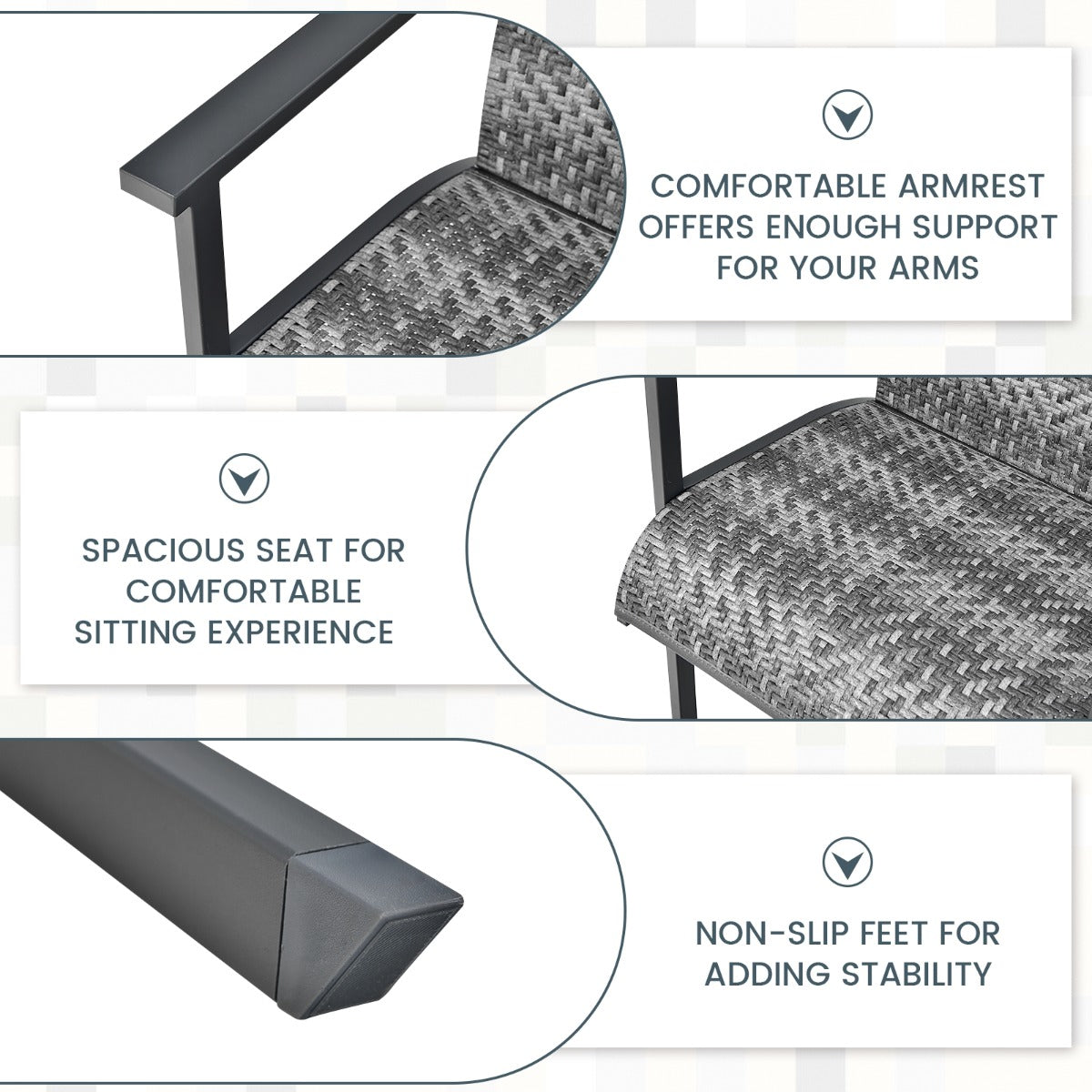 Patio Furniture Set: This 3-piece outdoor bistro set is made of weather-resistant PE rattan and a sturdy steel frame with a powder-coated finish, providing a long time service and will not rust or fade easily. Each chair can hold up to 150kg and the max weight capacity of the table is 50kg.
