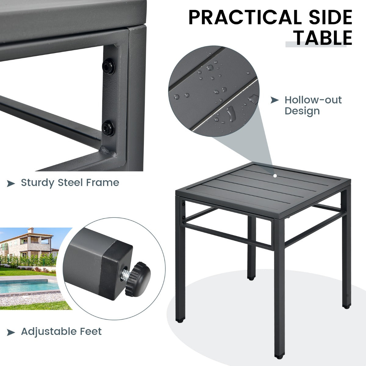 Practical Side Table: This patio furniture set features a stylish yet practical side table, which offers compact space for a couple of glasses of wine or morning coffee and newspaper. The adjustable feet help to keep balance on uneven ground. And the unique hollow-out design brings a touch of elegance to this set.