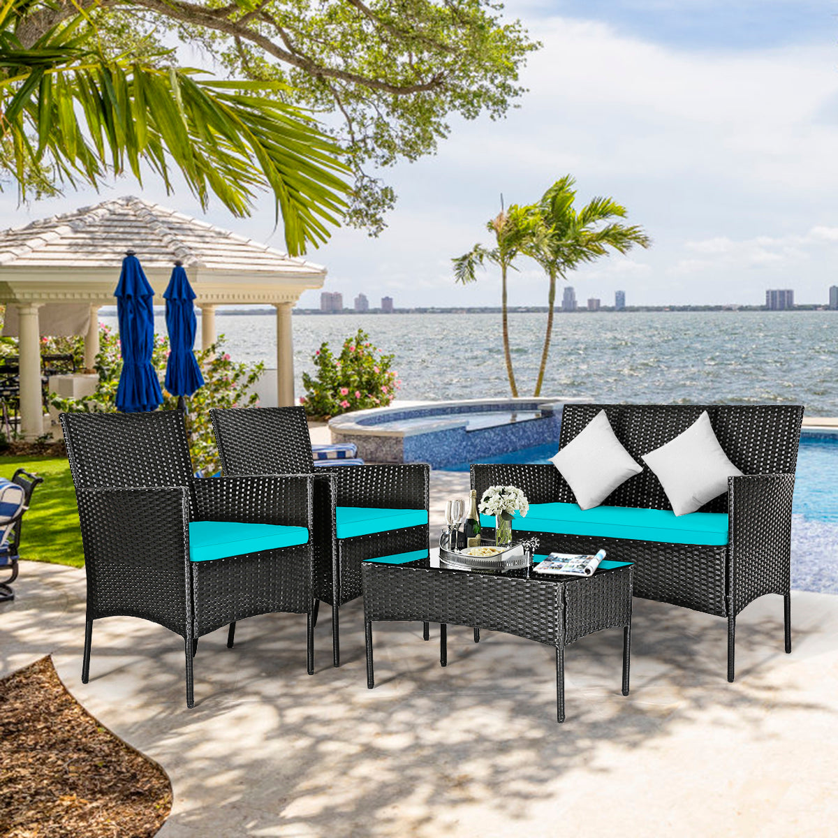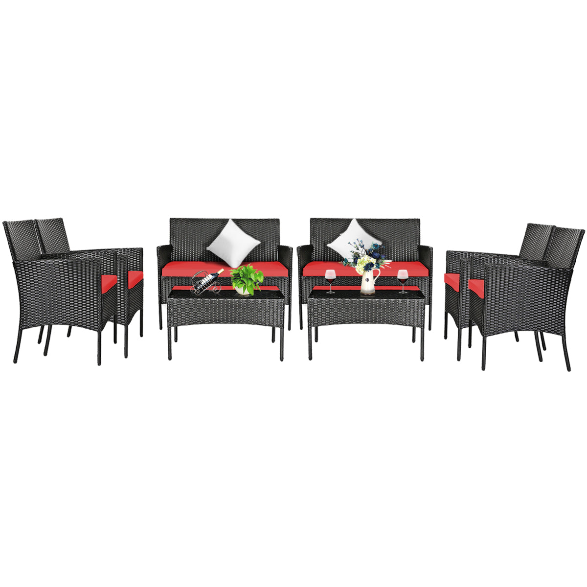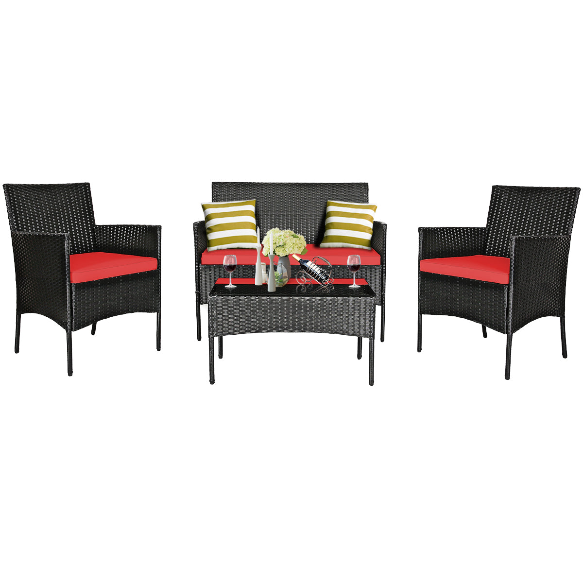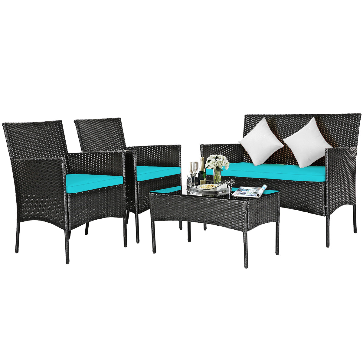 4 Pieces Patio Furniture Set: This furniture set includes 2 single chairs, 1 loveseat and a coffee table. 2 portable chairs can be easily moved to any place for use. And the wide loveseat offers ample space for two people to sit. Most importantly, it can be combined in a variety of ways to meet your different needs.