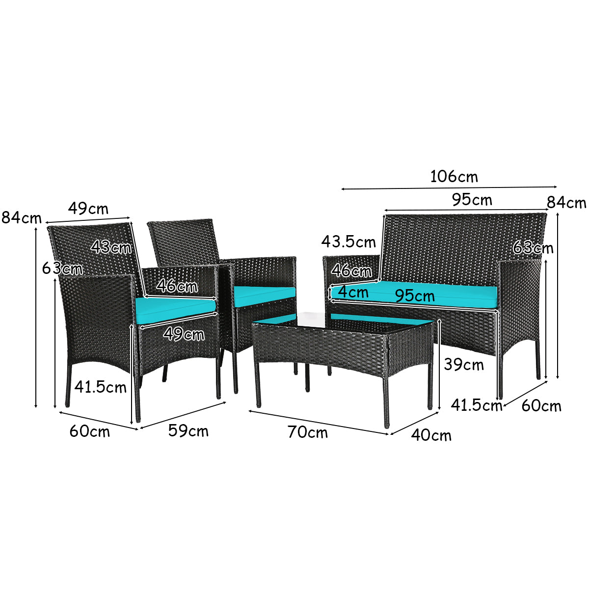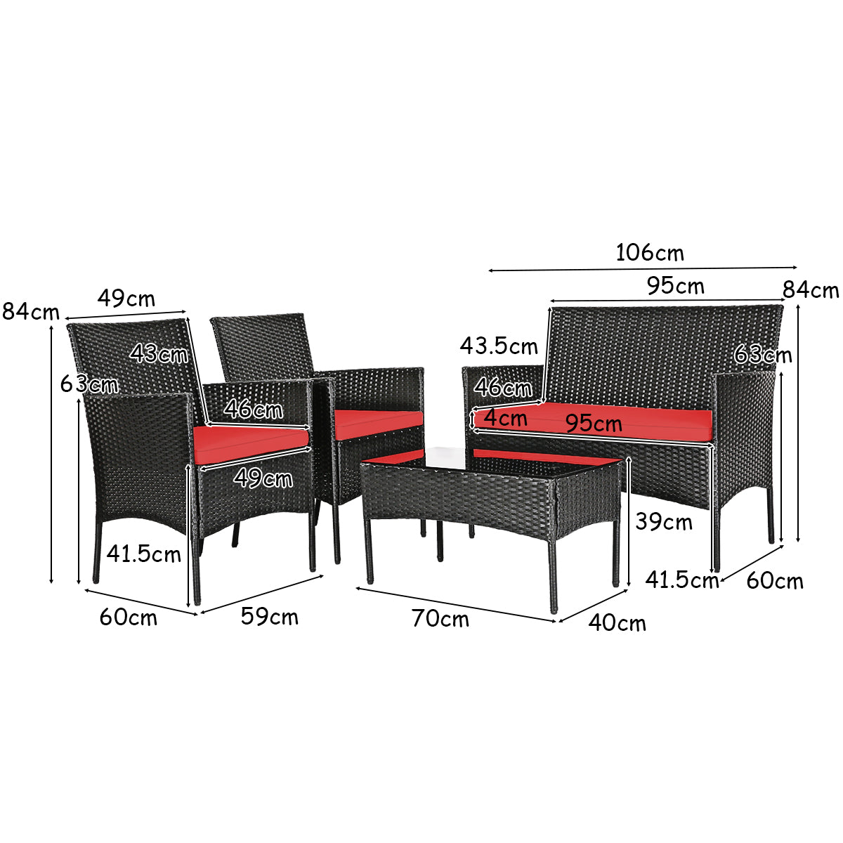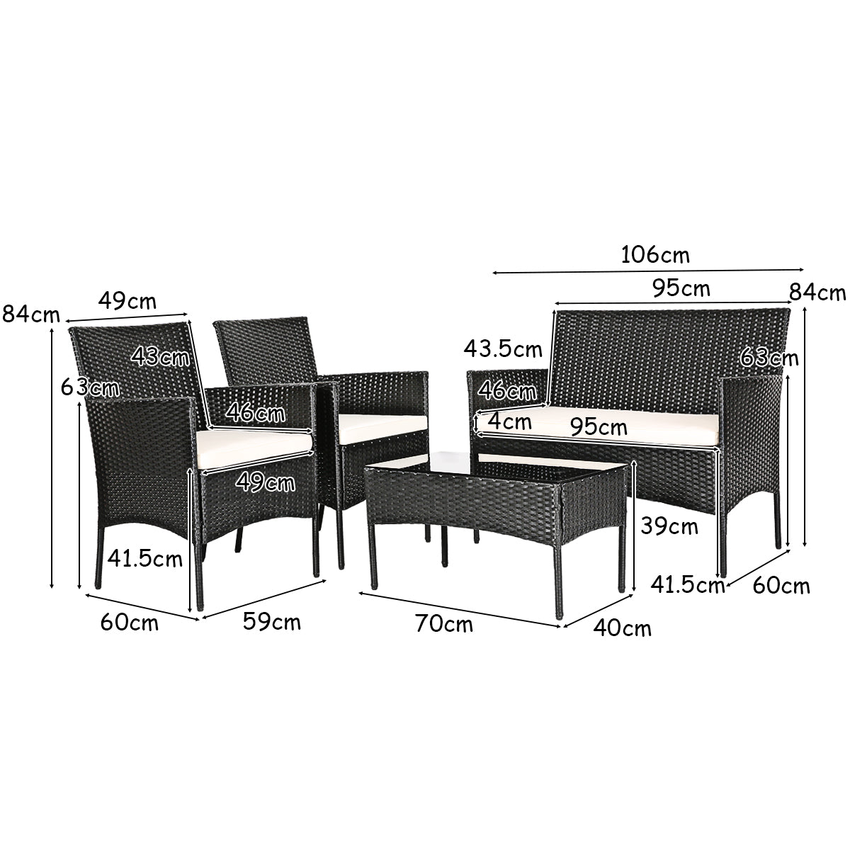 Dimension of Patio Furniture Set: Table size: 70 x 40 x 39 cm (L X W X H), single chair size: 59 x 60 x 84 cm (L X W X H), loveseat size: 106 x 60 x 84cm (L X W X H), height from floor to seat: 42 cm, height from floor to armrest: 63.5 cm, thickness of cushion: 4 cm, table weight capacity: 75 kg, single chair weight capacity: 180 kg, loveseat weight capacity: 360 kg