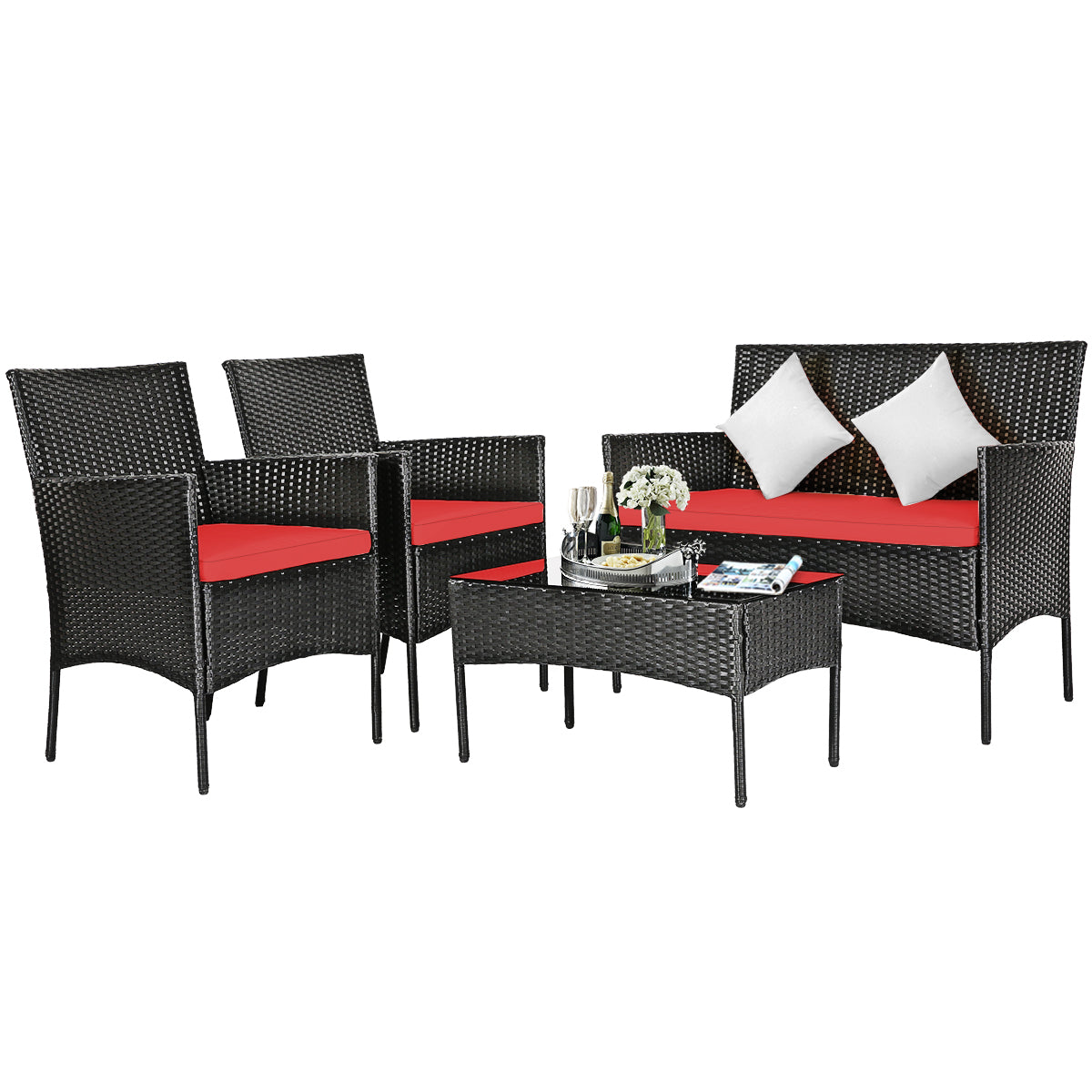 The practical 4 pieces of patio furniture sets provide a leisure zone for you and your family or friends to enjoy a cool outdoor time. The set is made of all-weather PE rattan and steel frame, which ensure durability and sturdiness for long servicing life. This set includes a loveseat, a table, and two single chairs that can be combined randomly according to requirements. Besides, the removable and washable seat cushions with zippers are also included in your package, giving you the utmost comfort. Meanwhile, a modern and classic appearance can match any outdoor space. It will be a great addition to your backyard, balcony, or poolside. If you are looking for an outdoor furniture set like this, do not miss it!