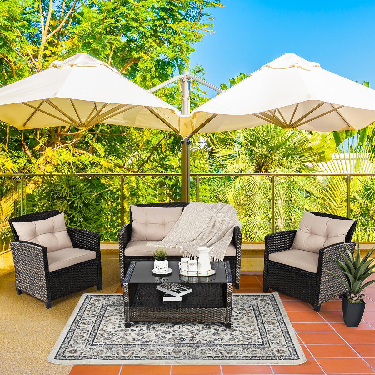 It's time to replace the outmoded outdoor furniture with our modern 4-piece patio wicker sofa and table set. Sturdy and solid steel frame with all weather PE rattan can keep stability and durability for long time use. Breathable and soft cushions will hold you comfortably and the cover of cushion can be removed with smooth zipper. Featuring with 1 coffee table, 1 loveseat and 2 single sofas, this patio furniture set can be combined in various ways according to your different needs. Moreover, the simple and stylish design enables you to put this sofa set in any place you want. So make this furniture set yours and be sure to share the best of times with your dear ones.